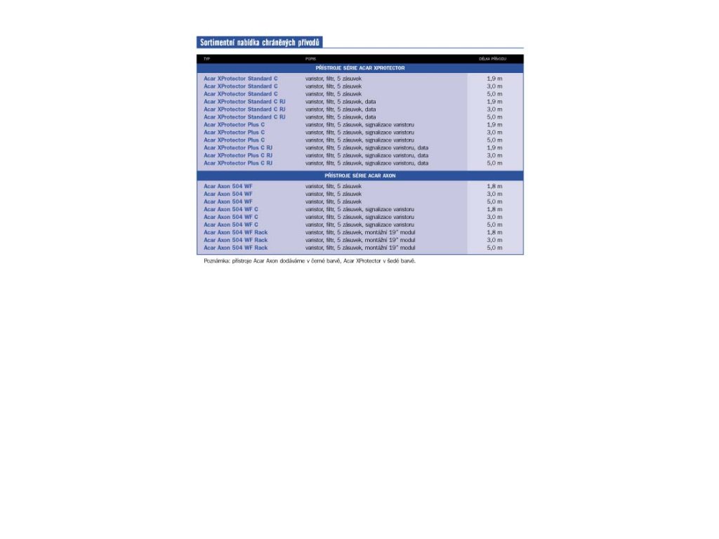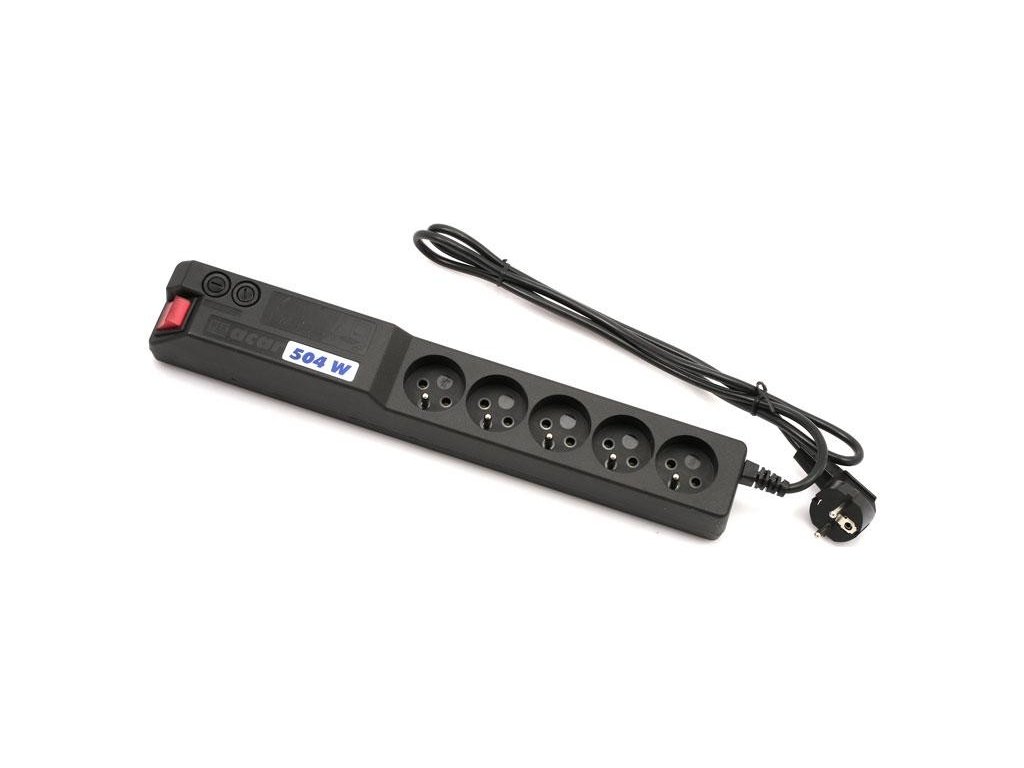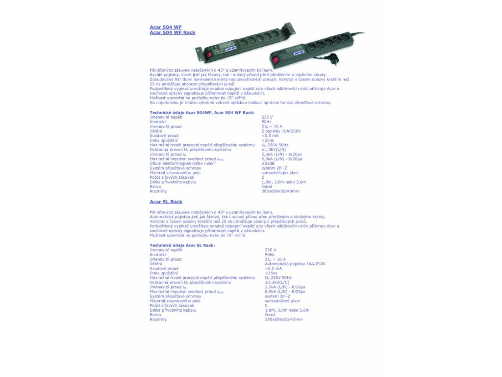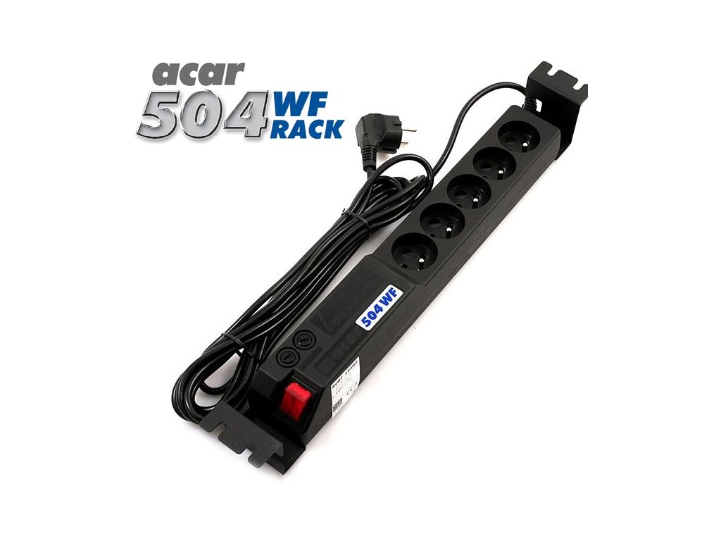 Napájecí panel ACAR A-504WF, 3 m, 5 pozic, s přepěťovou ochranou ACAR-A-504 PŘEHLED Přepěťová ochrana Acar 504 WF Rack *19'' *3m *černá, kovové ''uši'' pro upevnění do racku *19''Speciální verze modelu acar 504WF určená do 19'' skříní. Skutečná ochrana před přepětím spolu s novým filtračním obvodem odstraňujím elektromagnetická rušení. Dokonale chrání počítače a audio video zařízení. Zařízení je dodáváno včetně montážních plíšků, kterými se dá modul připevnit do rackové skříně. - do racku - 2U - 3m - 5 zásuvek - černá barva PŘÍSTROJ MUSÍ BÝT PŘIPOJEN VÝHRADNĚ K ZÁSUVKÁM S OCHRANNÝM KOLÍKEM (UZEMŇUJÍCÍM)