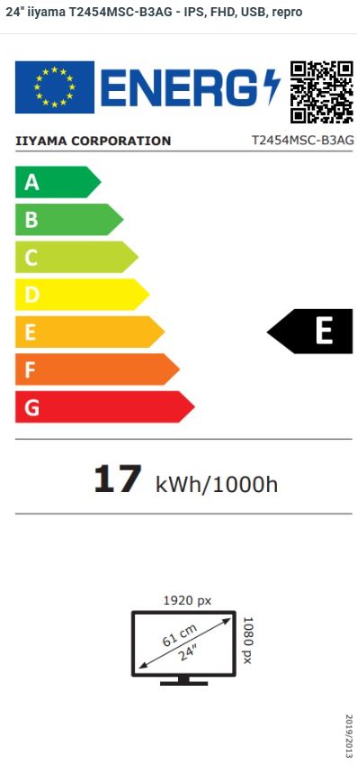 ProLite T2454MSC-B3AG *Živé barvy a široké pozorovací úhly *Hladká interakce a lepší ochrana *Pohodlné a všestranné použití *Vychutnejte si čistý, pohlcující zvuk Typ obrazovky: ,IPS Podsvícení: ,LED Úhlopříčka [palce]: ,23,8 Rozlišení: ,1920 x 1080 Rozteč bodu [mm]: ,02745 Obnovovací frekvence [Hz]: ,83 Poměr stran: ,16:9 Povrch displeje: ,Antireflexní Jas [cd/m2]: ,300 Kontrast: ,1 000:1 Odezva [ms]: ,4 Pozorovací úhly (Horizontál/Vertikál): ,178/178 Počet barev: ,16,7 mil. Reproduktory: ,2x 2W Konektory: , *1x DisplayPort *1x HDMI *1x Mini Jack Napájení: ,Interní Spotřeba [W]: ,17 Stand By režim [W]: ,1,5 Třída energetické náročnosti: ,E Montáž na zeď: ,VESA 100x100 Naklápění monitoru: , *Orientace: horizontální, face-up *Výškově nastavitelné: 111mm *Úhel náklonu: 90° nahoru, 5° dolů Barva: ,Černá Rozměry (se stojanem, ŠxVxH mm): ,540 x 373 x 241 Hmotnost [kg]: ,5,4 Obsah balení: , 1x Napájecí kabel 1x HDMI kabel 1x USB kabel Záruka: ,3 Roky Stránky výrobce: ,https://iiyama.com/cz_cs/produkty/prolite-t2454msc-b3ag/