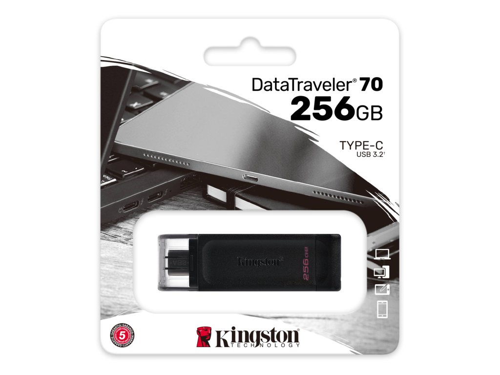 Kingston DataTraveler 70 USB-C flash disk Kingston DataTraveler 70® je přenosný, lehký USB-C flash disk kompatibilní s USB 3.2 Gen 1. Je navržen pro použití s ??kompatibilními zařízeními USB-C, jako jsou notebooky, notebooky, tablety a telefony. Kapacita: 256GB Rozhraní: USB-C Barva: černá Rozměry: 59x18,5x9mm Hmotnost: 7g Záruka: 5 let