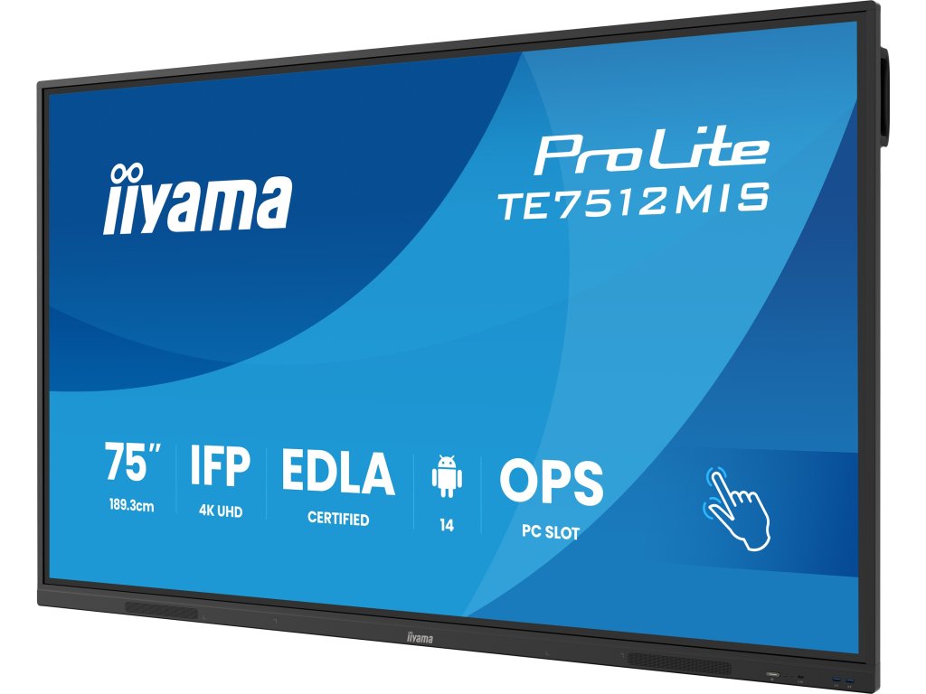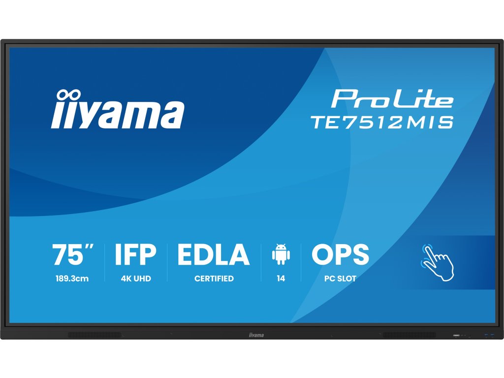 75'' interaktivní 4K UHD dotyková obrazovka pro pokročilou spolupráci *24/7 Typ obrazovky: VA DLED Podsvícení: DLED Úhlopříčka [palce]: 75'', 189,3 cm Rozlišení: 3840 x 2160 (8,3 megapixel 4K UHD) Rozteč bodu [mm]: 0,430 Obnovovací frekvence [Hz]: 60 Poměr stran: 16:9 Povrch displeje: Anti-Glare Coated Glass, Zero-Gap Air Bonding Jas [cd/m2]: 400 Kontrast: 5000:1 Odezva [ms]: 6,5 Pozorovací úhly (Horizontál/Vertikál): 178° / 178° Počet barev: 1,07 miliardy (8bit + FRC) Reproduktory: 2 x 16W (přední) Konektory: Analogové vstupní porty: VGA x1 (max. 1920x1080 @60Hz) Digitální vstupní porty: *HDMI x2 (2.0, max. 3840x2160 @60Hz, YUV444 (HDMI x1 compatible ARC/ CEC)) * DisplayPort x1 (max. 3840x2160 @60Hz) * USB-C x2 (3.2 (Gen 1, 5Gbit), 3840x2160 @60Hz - RGB444 - (Touch, 1x Front 65W PD, 1x Back 15W PD)) Audio input: Mini jack x1 Řídíci vstup monitoru: * RS-232c x1 (DSUB 9pin) * RJ45 (LAN) x1 (LAN Control) * IR x1 Digitální výstupní porty: HDMI x1 (3840x2160 @60Hz) Audio Out: *S/PDIF (Optical) x1 * Mini jack x1 * Reproduktory 2 x 16W (Přední) Řidící výstup monitoru: OPS Slot x1 HDCP HDMI: 1: 2.1, USB-C: 2.2 USB ports: x5 (media playback / peripherals / storage – front side: 2x USB 3.2 (Gen 1, 5Gbit), 1x USB-C 3.2 (Gen 1, 5Gbit, 65W PD), side: 2x USB 3.2 (Gen 1, 5Gbit), back: 1x USB-C 2.0 (Gen 1, 5Gbit, 15W PD)) RJ45 (LAN): x2 (Auto switch for PC & Android, 1000MB) WiFi: ano (WiFi 6 - Dual WiFi Bandwidth: 2.4GHz/5GHz, WiFi Standard: IIEEE 802.11 a/b/g/n/ac/ax, Bluetooth Support: 2.1+EDR/ 3.0/ 4.x/ 5.0) Dotyková technologie: PureTouch-IR Počet dotykových bodů: 40, 5pt writing (HID, pouze s podporovanými OS) Přesnost dotyku: ±1,5 mm Metoda dotyku: stylus, prst, rukavice (pasivní pero, neprůhledné objekty) Touch interface: USB Podporované OS: Všechny monitory iiyama jsou Plug & Play a kompatibilní s Windows a Linuxem. Napájení: AC 100 – 240V, 50/60Hz Spotřeba [W]: 174 Stand By režim [W]: 0,5 Třída energetické náročnosti: G Montáž na zeď: VESA 800 x 400 mm Barva: černá, matná Rozměry (bez stojanu, ŠxVxH mm): 1709 x 1020 x 98 Hmotnost [kg]: 39 Obsah balení: napájecí kabel, USB kabel, HDMI kabel, 4x Touch pen, držák pro NUC, držák pro webkameru, dálkové ovládání (včetně baterie), uživatelský manuál, instrukce bezpečnosti Záruka: 5 let