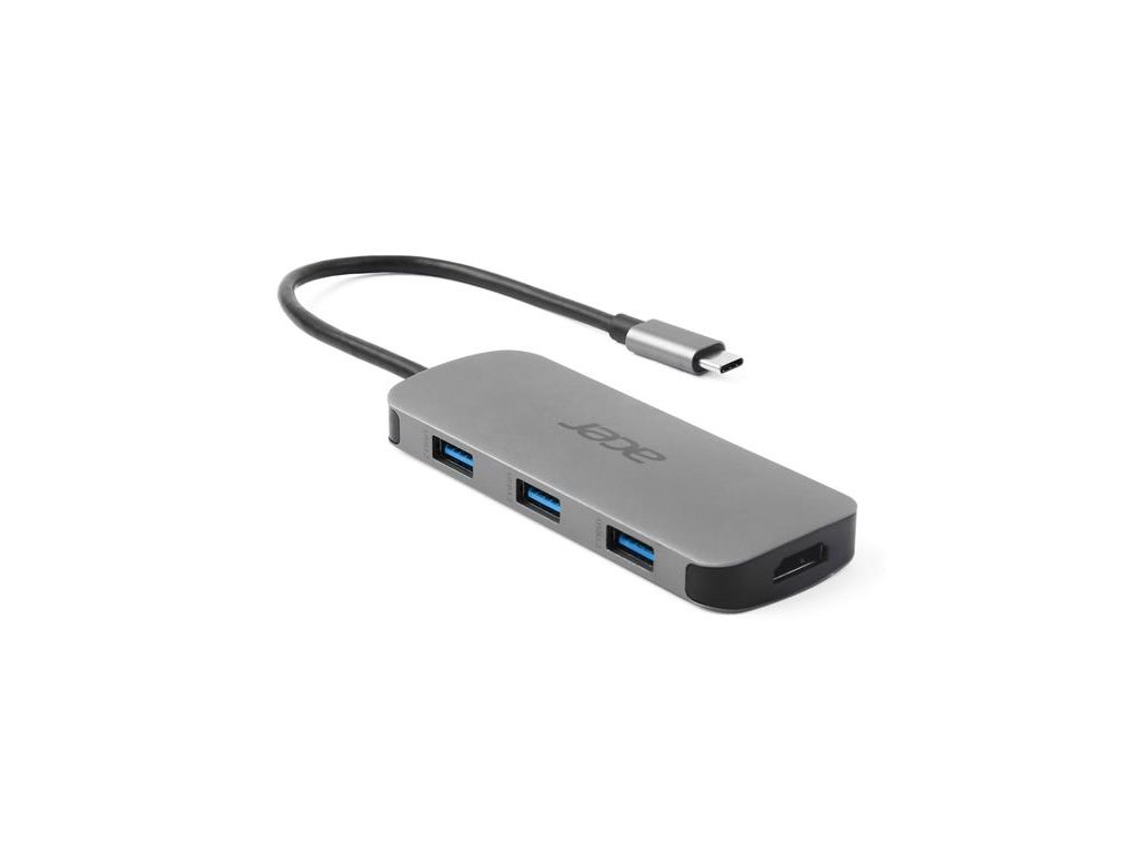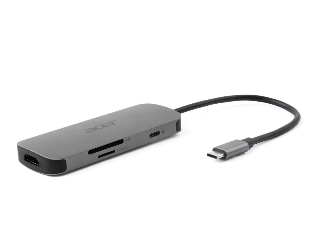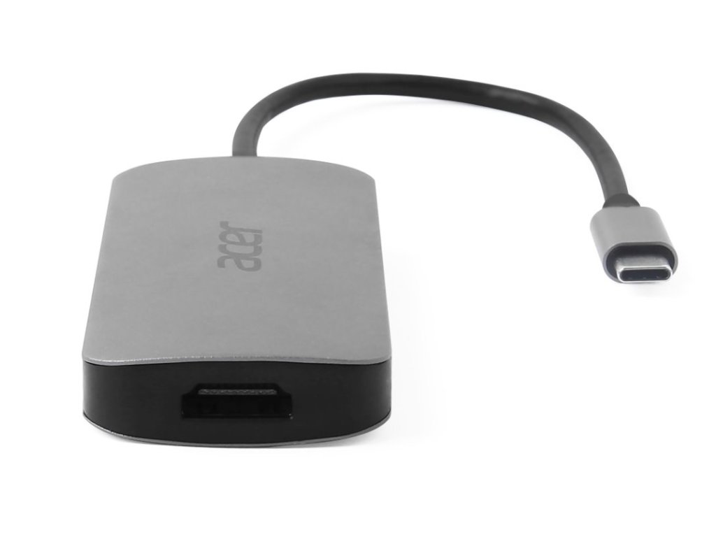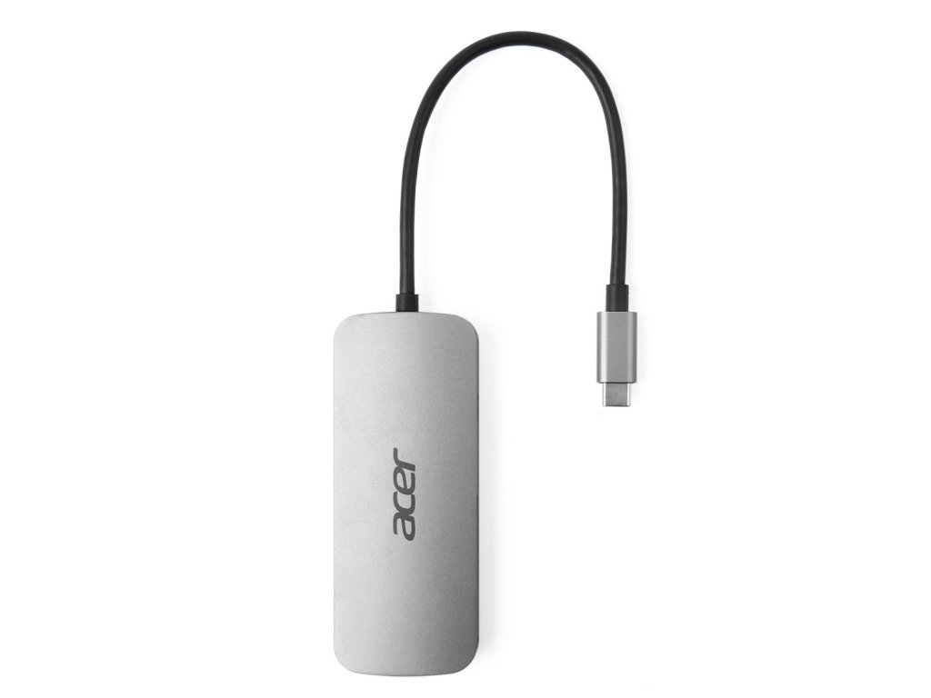 Acer 7in1 Type-C dongle: 1x HDMI (až 8K@30Hz), 3x USB-A 3.2 Gen1 (5Gbps Data Transfer), 1x SD 3.0, 1x microSD, 1x USB-C (Power Delivery max. 100W), hm. 58 g, rozměry 102 x 40 x 12,5 mm, silver