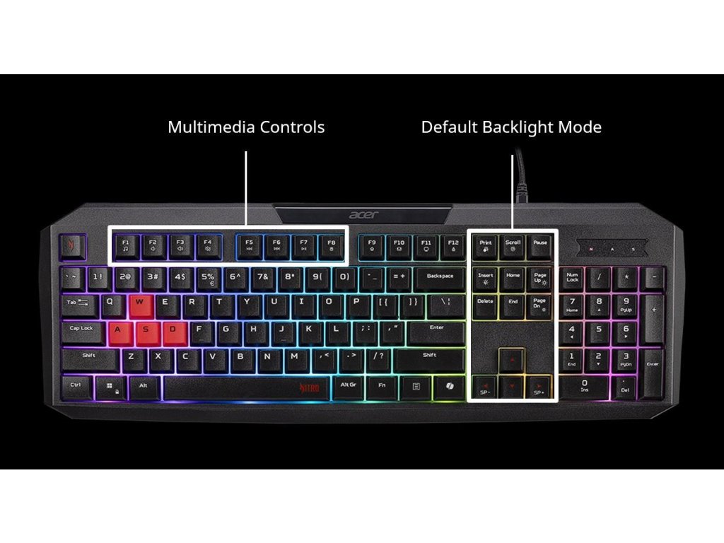 ACER Nitro Gaming Keyboard 100, Membrane Switch, 26 Anti-ghosting kláves, životnost 3 mil. stisků, 7 zón RGB podsvíc GP.KBD11.05X Acer