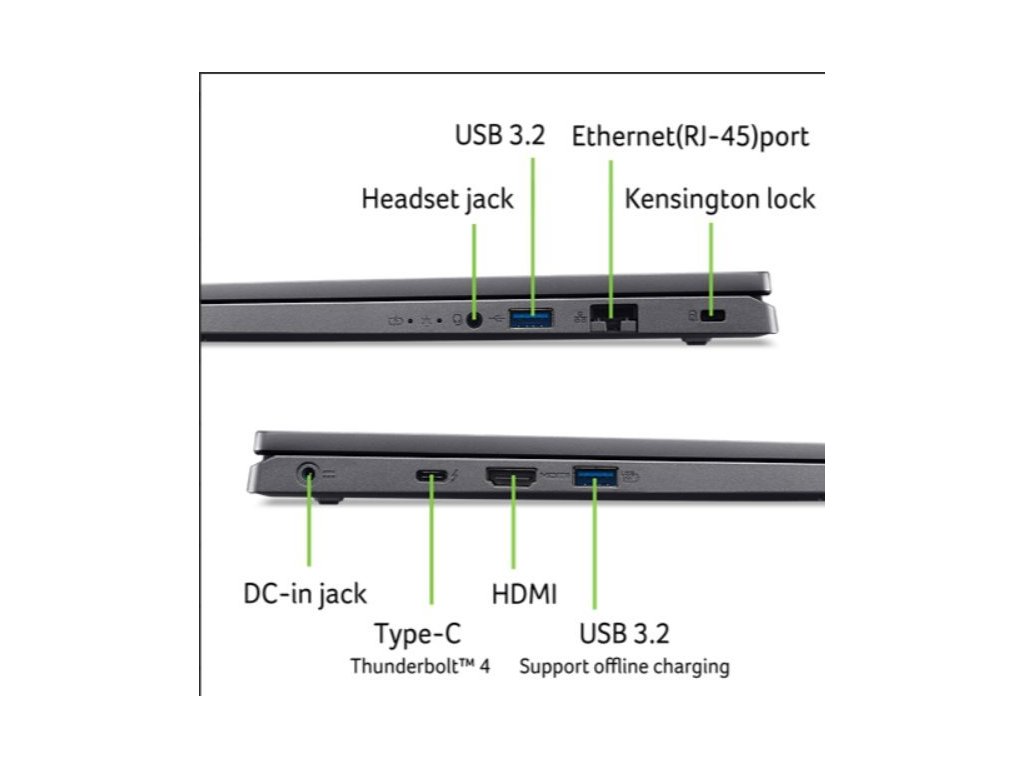 Aspire 16 (A16-71GM-76JL) - Windows 11 Home - Intel® Core™ Ultra 7 processor 155H - 8GB DDR5 Memory On Board + 8 GB DDR5 Memory (up to 5600MHz) - 1024GB PCIe NVMe SSD PM4 + N (M.2) - 16" WUXGA 1920x1200 16:10 IPS Anti-Glare - NVIDIA® GeForce RTX™ 3050 6G-GDDR6 (2C*512*16*3) 16Gbps - WIFI 6E Intel 802.11ax 2x2 MU-MIMO + BT 5.3 LE Audio - FHD USB TNR Camera with 2Mic. - Backlight KB - Finger Print on Touchpad - 2x USB 3.2 Gen1 - 2x USB Type-C port supporting: USB4 ® 40Gbps / Display port over USB-C / Thunderbolt™ 4 / USB charging 5 V; 3 A / DC-in port 20 V; 100 W - HDMI 2.1 - RJ-45 - Copilot Key (AI) - Acer Sense App - 65Wh Li-ion battery - 100W USB Type-C AC Adapter PCR50% TCO9.0 - Steel Gray + Steel Gray Aluminum LCD cover