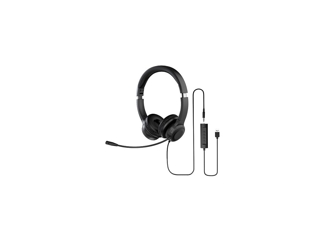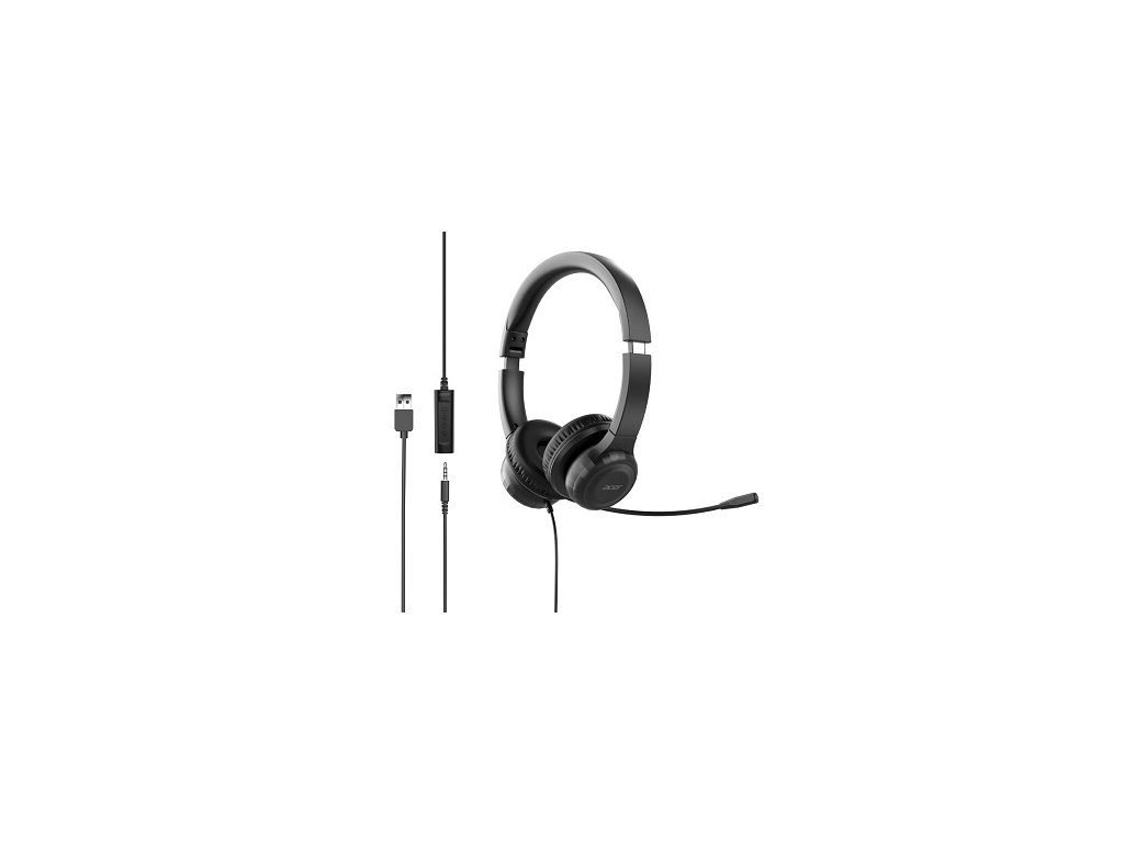 Acer Office Headset, 3,5 mm Jack / USB s ovládáním na kabelu; reproduktory: 30mm měniče; frekvenční rozsah 20Hz-20kHz; impedance 32Ohm ± 15%; citlivost 122db ± 3dB; mikrofon: 50Hz-10 kHz; citlivost -38 ± 2dB; skládací konstrukce; hmotnost cca 160 ± 10g; černé (AHW154)