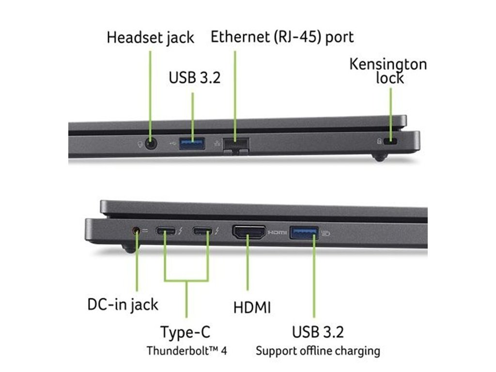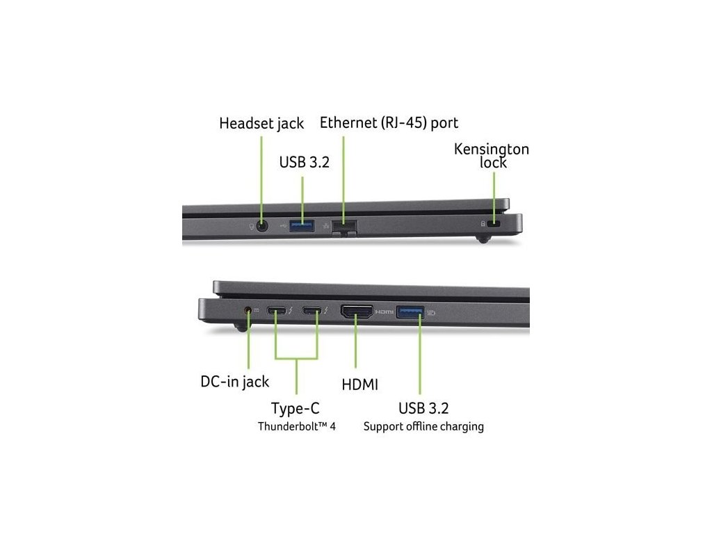 TravelMate P2 16 (TMP216-71-G3-TCO-569M) - Windows 11 Professional 64-bit - Intel® Core™ Ultra 5 processor 125H - 16 GB DDR5 Memory + N - 1024GB PCIe NVMe SSD PM4 + N (M.2) - Micro SD card reader - 16" WUXGA 1920x1200 16:10 IPS Anti-Glare 300nits - Intel® Graphics - WIFI 6E Intel 802.11ax 2x2 CNVi + BT 5.2 - FHD IR camera with 2Mic. with camera shutter - Backlight KB - Finger Print - Smart Card reader - 2x USB 3.2 Gen1 - 2x USB Type-C port supporting: USB4® 40 Gbps / Display port over USB-C / Thunderbolt™4 / USB charging 5 V; 3 A / DC-in port 20 V; 65 W with USB Type-C docking support - HDMI 2.0 - RJ-45 - chip TPM 2.0 - Acer Dust Defender - TravelMateSense App - 65Wh Li-ion battery - 100W USB Type-C AC Adapter PCR50%_TCO9.0 - MIL-STD 810H certification - TCO certified - Steel Gray