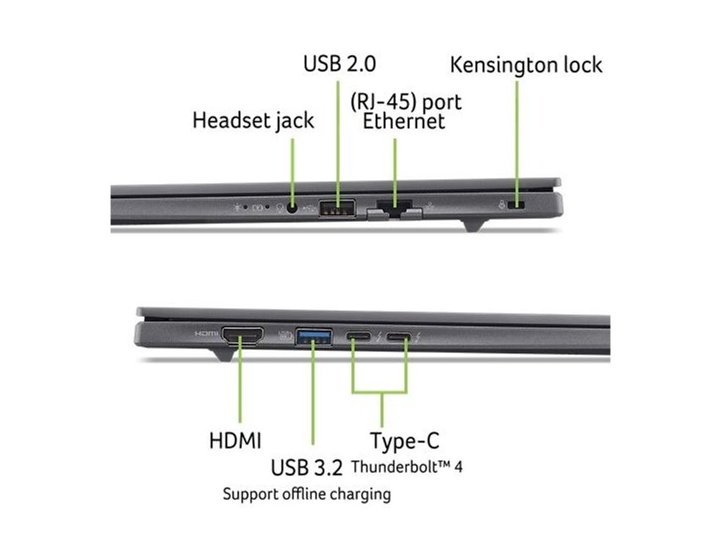 TravelMate X4 14 AI (TMX414-51-TCO-53ZR) - Copilot+ PC - Windows 11 Professional 64bit - Intel® Core™ Ultra 5 processor 226V - Intel® AI Boost up to 40 TOPS - 16 GB LPDDR5X Memory On Board + N/A - 1024GB PCIe NVMe SSD PM4 + N/A - 14" WUXGA 1920x1200 16:10 IPS Anti-Glare sRGB 100% 120Hz 300nits - Intel® Graphics - WIFI 7 Intel 802.11be 2x2 MU-MIMO + BT 5.4 LE Audio - FHD IR Camera with 3Mic. and camera shutter + Vision sensor - Backlight KB - 2x USB Type-C port supporting: USB4® 40Gbps / Display port over USB-C / Thunderbolt™ 4 / USB charging 5 V; 3 A / DC-in port 15 or 20 V; 100 W - 1x USB-A 3.2 Gen1 - 1x USB-A 2.0 - HDMI 2.1 - TPM chip 2.0 - 65Wh Li-ion battery - 100W USB Type-C AC Adapter PCR50% TCO10.0 - MIL-STD 810H certification - TCO certified - Steel Gray + Steel Gray Aluminium LCD + bottom cover (laptop)