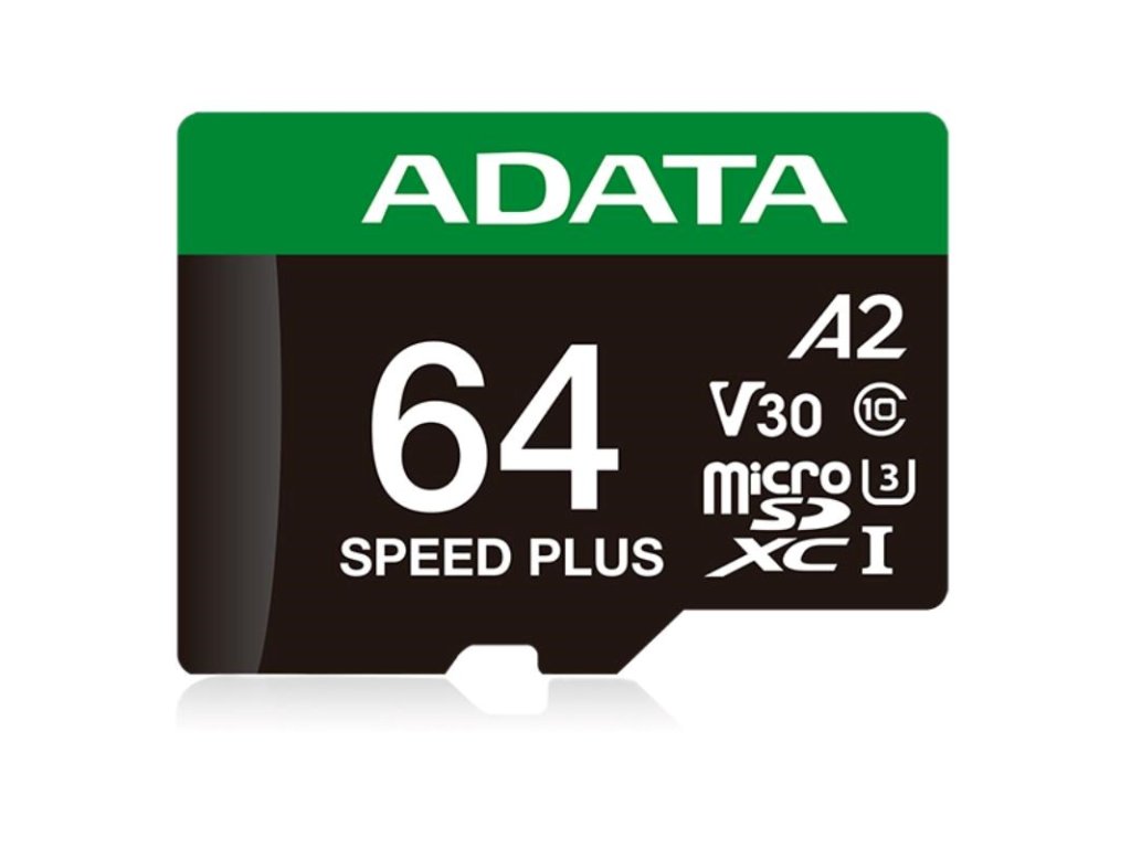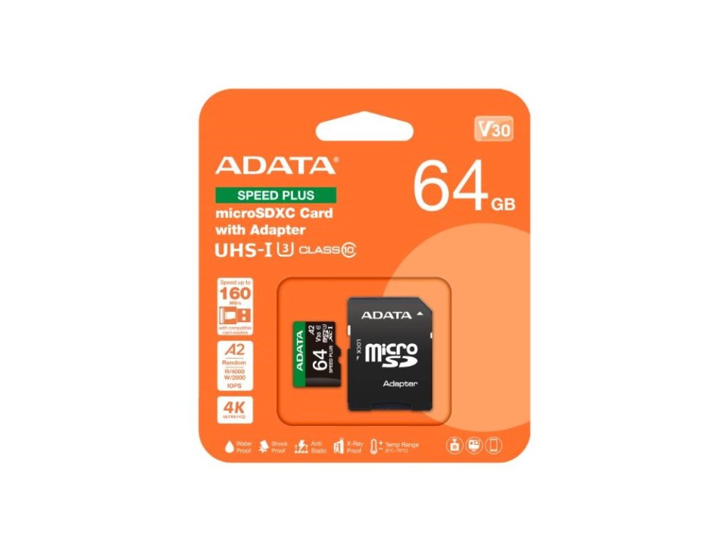 ADATA MicroSDXC karta 64GB Speed Plus, U3, C10, A2, V30 (R:160/W:140 MB/s) + SD adaptér UD64GUI3V30A2SP-RA1