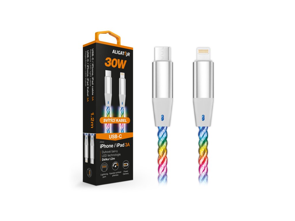 Duhově svítící LED kabel řady ALIGATOR POWER s kovovými konektory USB-C/Lightning nejvyšší kvality, o výkonu 30W a možností nabíjení až 3A. Nudí Vás fádní kabel a přitom je pro Vás výkon na prvním místě? Pak je tento duhově svítící LED kabel tím pravým parťákem! Světelný efekt zajišťuje důkladně zabudovaná LED technologie, která ihned po připojení začne měnit barvy v RGB modelu a poskytuje tak nevšední podívanou. Samozřejmostí je podpora protokolu Power Delivery s nabíjecím proudem až 3A s možností extra rychlého nabíjení o výkonu 30W pro iPhone a iPad. Díky zkrácené délce 50cm si snadno a pohodlně nabijete Váš mobilní telefon, tablet a další zařízení, aniž byste se do kabelu zamotávali. Kabel je vyroben z odolného a ohebného materiálu s měděným opletením, které protkávají optická vlákna. Celou prestiž tohoto nabíjecího kabelu uzavírají vysoce kvalitní kovové konektory. Vše je zpracováno precizně a stylově. Celá řada duhově svítících LED kabelů je navržena pro denní použití doma, v kanceláři i na cestách. Máte automobil s USB-C slotem? Naše řada ALIGATOR POWER Vám vyřeší propojení téměř všech mobilních zařízení s automobilem a zajistí zpětnou kompatibilitu zrcadlení navigace s vysokou přenosovou rychlostí. Datový a nabíjecí USB-C /Lightning kabel: LED technologie Kabel po připojení ihned svítí a mění barvy Duhové barvy RGB Ultra rychlé nabíjení: 3A Power Delivery až 30W Kompatibilní s iPhone s konektorem Lightning Kompatibilní s iPadem s konektorem Lightning Kompatibilní se zařízeními s konektorem Lightning Vysoká rychlost přenosu dat Vysoce kvalitní kovové konektory Precizní zpracování měděného opletení Flexibilní a odolný Délka: 50cm
