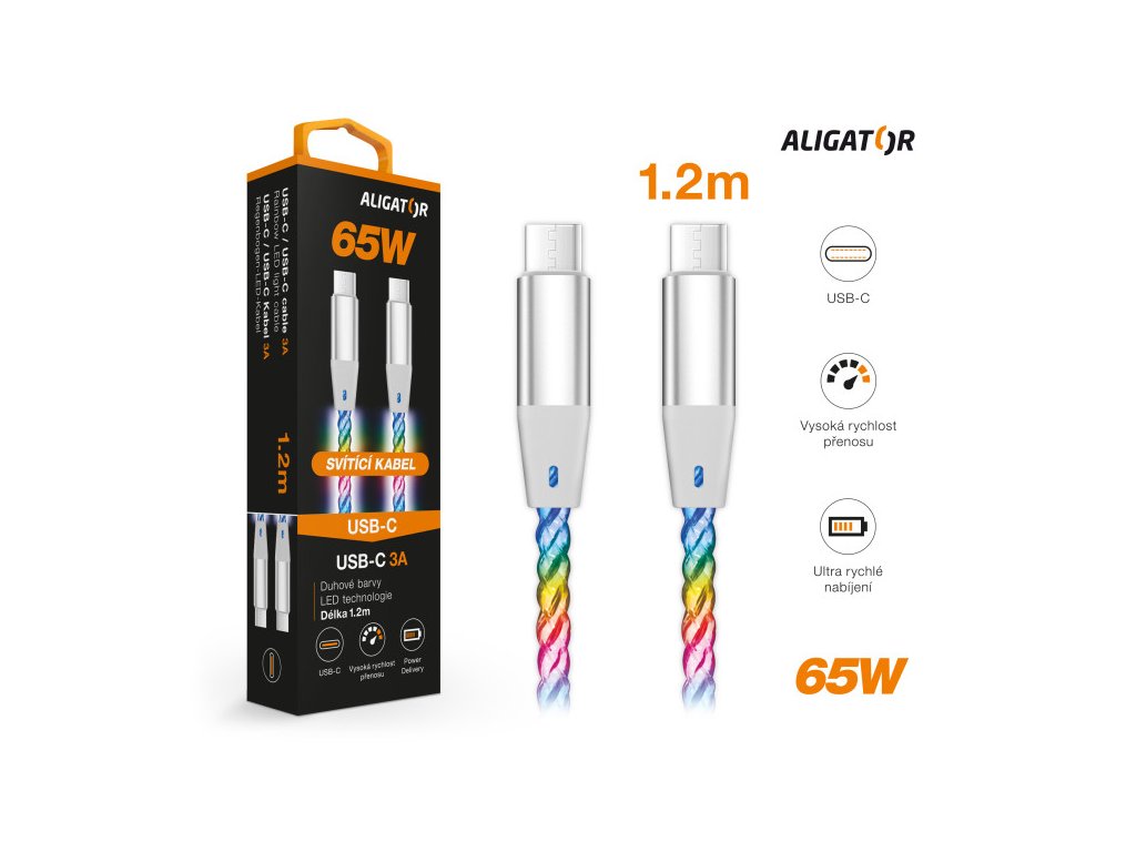 Duhově svítící LED kabel řady ALIGATOR POWER s kovovými konektory USB-C/USB-C nejvyšší kvality, o výkonu 65W a možností nabíjení až 3A. Nudí Vás fádní kabel a přitom je pro Vás výkon na prvním místě? Pak je tento duhově svítící LED kabel tím pravým parťákem! Světelný efekt zajišťuje důkladně zabudovaná LED technologie, která ihned po připojení začne měnit barvy v RGB modelu a poskytuje tak nevšední podívanou. Samozřejmostí je podpora protokolu Power Delivery s nabíjecím proudem až 3A s možností extra rychlého nabíjení o výkonu 65W. Díky zkrácené délce 50cm si snadno a pohodlně nabijete Váš mobilní telefon, tablet nebo také notebook a další zařízení, aniž byste se do kabelu zamotávali. Kabel je vyroben z odolného a ohebného materiálu s měděným opletením, které protkávají optická vlákna. Celou prestiž tohoto nabíjecího kabelu uzavírají vysoce kvalitní kovové konektory. Vše je zpracováno precizně a stylově. Celá řada duhově svítících LED kabelů je navržena pro denní použití doma, v kanceláři i na cestách. Máte automobil s USB-C slotem? Celá naše řada ALIGATOR POWER Vám vyřeší propojení téměř všech mobilních zařízení s automobilem a zajistí zpětnou kompatibilitu zrcadlení navigace s vysokou přenosovou rychlostí. Datový a nabíjecí USB-C /USB-C kabel: LED technologie Kabel po připojení ihned svítí a mění barvy Duhové barvy RGB Ultra rychlé nabíjení: 3A Power Delivery až 65W Vysoká rychlost přenosu dat Vysoce kvalitní kovové konektory Precizní zpracování měděného opletení Flexibilní a odolný Délka: 50cm