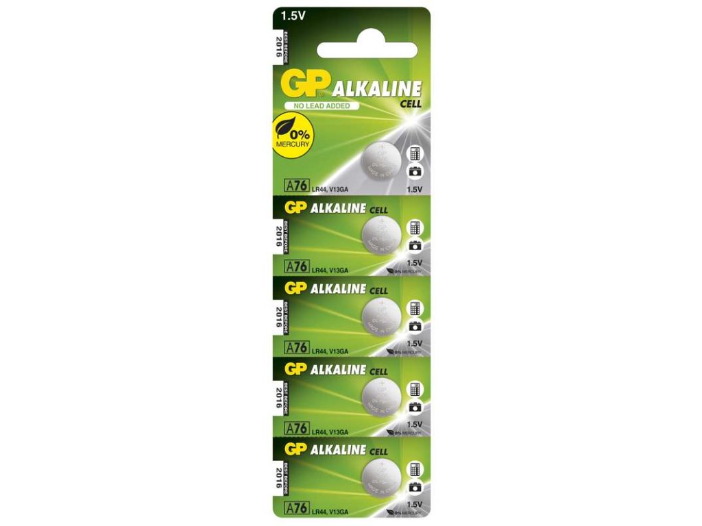 Alkalická knoflíková baterie GP LR44 (A76F), 5 ks specifikace: možnost nabíjení ne chemické složení alkalické napětí 1,5 V kategorie/řada Alkaline cell jmenovitá kapacita 110 mAh (při zátěži 1,6 kOhm) typové označení GP A76F (AG13, LR44, LR1154, V13GA, PX76A) rozměr 11,6 × 5,40 mm cena za množství cena za 1 ks prodejní obal 5 ks, blistrDodatočné parametre