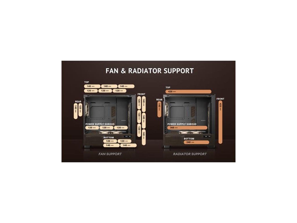 - Nech už sa rozhodnete pre vzduchové alebo kvapalinové chladenie, skriňa Antec Flux Pro ponúka takmer neobmedzené možnosti: Vďaka voľnému priestoru 190 mm pre vzduchové chladiče poskytuje dostatok miesta pre chladiče NH-D15 a NH-D15 G2, a to aj v prípade, že je potrebné posunúť predný ventilátor nahor, aby sa uvoľnil priestor pre pamäť RAM. Pokiaľ ide o kvapalinové chladenie, Flux Pro pojme 360 a 420 mm radiátory ako v hornej, tak aj v prednej časti.