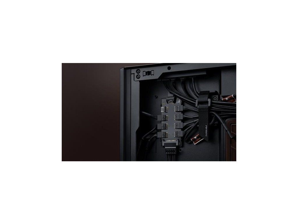 - Antec Flux Pro ponúka vynikajúce možnosti vedenia káblov. Všetky káble ventilátorov sú už vopred pekne vedené, takže ventilátory je možné pripojiť buď priamo k rozbočovaču NA-FH1, alebo k vopred namontovaným predlžovacím káblom.