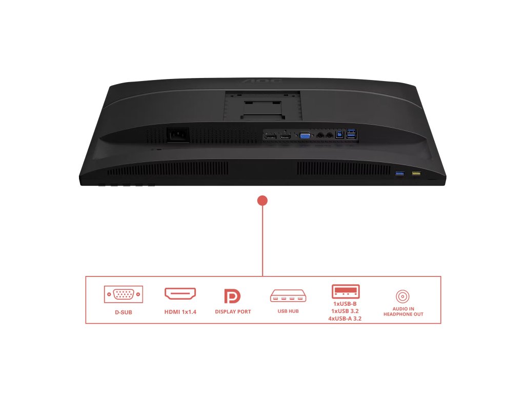 AOC X24E4U *HDR Mode *Adaptive Sync *Flicker Free *TUV Eye Comfort *TCO Certified *Kensington Lock Typ obrazovky: ,IPS Podsvícení: ,WLED Úhlopříčka [palce]: ,24 Rozlišení: ,1 920 x 1 200 Rozteč bodu [mm]: ,0.27 Obnovovací frekvence [Hz]: ,100 Poměr stran: ,16:10 Povrch displeje: ,Antireflexní Jas [cd/m2]: ,300 Kontrast: ,1 500:1 Odezva [ms]: ,4 Pozorovací úhly (Horizontál/Vertikál): ,178/178 Počet barev: ,16,7 M. Reproduktory: ,2x 2W Konektory: , *1x HDMI 1.4 *1x VGA *1x DisplayPort *4x USB-A *1x USB-B *1x ,Headphone out (3.5mm), Audio in Napájení: ,interní Spotřeba [W]: ,15,5 Stand By režim [W]: ,0,3 Třída energetické náročnosti: ,B Montáž na zeď: ,VESA 100x100 Naklápění monitoru: , *Naklonění: -5°/30° *Pivot: -90°/90° *Natočení: -180°/180° *Výškově nastavitelné:150mm Barva: ,Černá Rozměry (se stojanem, ŠxVxH mm): ,533.2 x 381.5~531.4 × 219.4 Rozměry (bez stojanu, ŠxVxH mm): ,533.2 x 347.4 × 49.5 Hmotnost [kg]: ,5,22 Obsah balení: , *HDMI kabel *DisplayPort kabel *Napájecí kabel Záruka: ,5 let Stránky výrobce: ,https://aoc.com/si/monitors/x24e4u#compactFeatureHighlighter