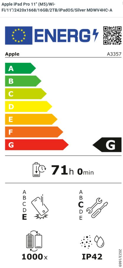 Apple iPad Pro 11'' (M5) Wi-Fi Operační systém: iPadOS 26 Procesor: Apple M5, 10 jádrové CPU (4P+6E), 10 jádrové GPU, 16 jádrový Neural Engine, propustnost paměti 153 GB/s Paměť: 16GB Pevný disk: 2TB Čtečka paměťových karet: ne Displej: dotykový 11'' Ultra Retina XDR, Tandem OLED, 2420x1668 při 264ppi, 1000 nitů, 120 Hz, antireflexní Audio: 4x reproduktor, 4x mikrofon Web kamera zadní: 12MPx, f/1,8, 4K video, ProRes, HDR 4 Web kamera přední: 12MPx, f/2,0, centrování záběru, TrueDepth, FaceTime video Určování polohy: * digitální kompas * Wi-Fi * mikrolokalizace iBeacon Senzory: * Face ID * LiDAR skener * tříosý gyroskop * akcelerometr * barometr * okolního osvětlení Bezdrátová komunikace: Wi-Fi 7 (802.11be) + Bluetooth 6 Porty: * Thunderbolt/USB 4 * magnetický konektor * smart konektor Baterie: vestavěná lithium-polymerová baterie s kapacitou 31,29Wh Výdrž baterie: až 10 hodin Barva: stříbrná Rozměry: 249,7x177,5x5,3mm Hmotnost: 444g V krabici: * iPad Pro * USB-C nabíjecí kabel (1m)
