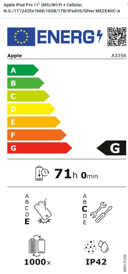 Apple iPad Pro 11'' (M5) Wi-Fi + Cellular, sklo displeje s nanotexturou Operační systém: iPadOS 26 Procesor: Apple M5, 10 jádrové CPU (4P+6E), 10 jádrové GPU, 16 jádrový Neural Engine, propustnost paměti 153 GB/s Paměť: 16GB Pevný disk: 1TB Čtečka paměťových karet: ne Displej: dotykový 11'' Ultra Retina XDR, Tandem OLED, 2420x1668 při 264ppi, 1000 nitů, 120 Hz, antireflexní Audio: 4x reproduktor, 4x mikrofon Web kamera zadní: 12MPx, f/1,8, 4K video, ProRes, HDR 4 Web kamera přední: 12MPx, f/2,0, centrování záběru, TrueDepth, FaceTime video Určování polohy: * digitální kompas * Wi-Fi * mikrolokalizace iBeacon * GPS/GNSS * mobilní síť Senzory: * Face ID * LiDAR skener * tříosý gyroskop * akcelerometr * barometr * okolního osvětlení Bezdrátová komunikace: * Wi-Fi 7 (802.11be) + Bluetooth 6 * 5G (pásma sub-6 GHz) s technologií MIMO 4×4 * Gigabitové LTE s technologií MIMO 4×4 * eSIM Porty: * Thunderbolt/USB 4 * magnetický konektor * smart konektor Baterie: vestavěná lithium-polymerová baterie s kapacitou 31,29Wh Výdrž baterie: až 9 hodin Barva: stříbrná Rozměry: 249,7x177,5x5,3mm Hmotnost: 446g V krabici: * iPad Pro * USB-C nabíjecí kabel (1m) * čisticí hadřík skla displeje s nanotexturou