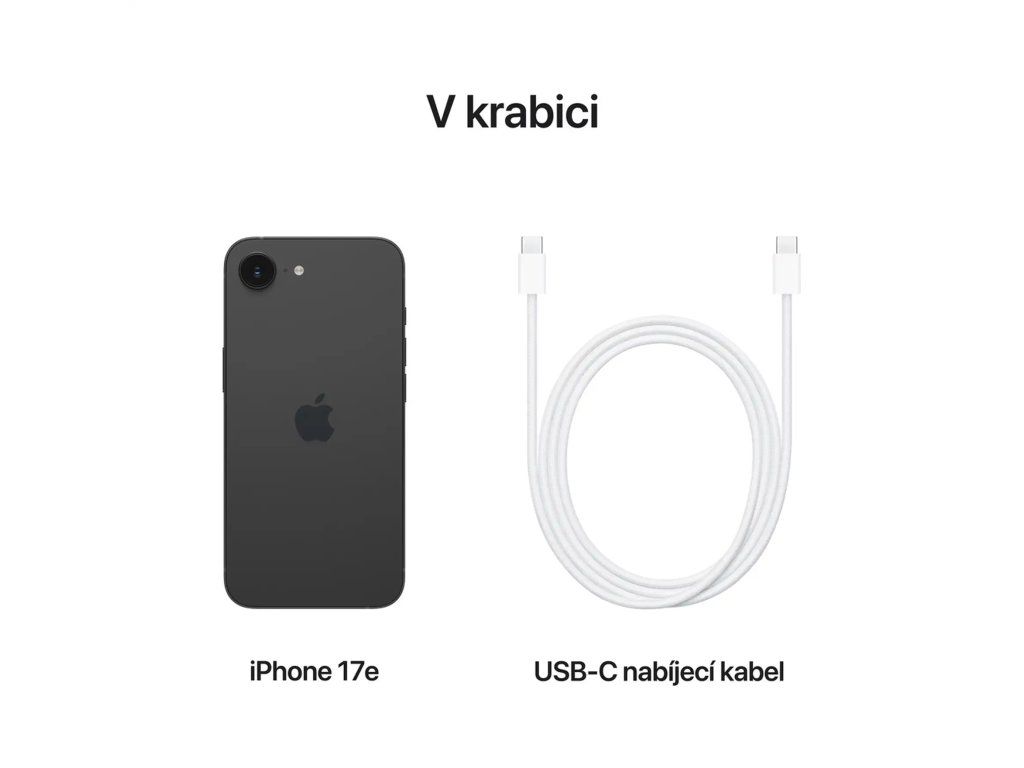 Apple iPhone 17e 512GB černý * tísňové SOS volání * detekce autonehody * až 26 hodin přehrávání videa Operační systém: iOS 26 Procesor: čip A19 (6jádrové CPU se 2 výkonnostními a 4 úspornými jádry, 4jádrové GPU s Neural Acceleratory, 16jádrový Neural Engine) Kapacita úložiště: 512GB Konstrukce: * hliník * Ceramic Shield 2 na přední straně * skleněná zadní strana Displej: 6,1” Super Retina XDR (OLED, 2532×1170 při 460 ppi) * HDR * True Tone * široký barevný rozsah (P3) * Haptic Touch * kontrastní poměr (typický) 2000000:1 * maximální jas (typický) 800 nitů, špičkový jas (HDR) 1200 nitů * oleofobní úprava proti šmouhám * antireflexní vrstva * podpora současného zobrazení více jazyků a znaků Stupeň krytí: IP68 (až 30 minut v hloubce do 6 metrů) Fotoaparát: zadní * 48Mpx hlavní Fusion fotoaparát: 26 mm, clona f/1,6, optická stabilizace obrazu s posuvem snímače, 100% Focus Pixels, fotky v supervysokém rozlišení (24 Mpx a 48 Mpx) * podpora 12Mpx 2× přiblížení v optické kvalitě: 52 mm, clona f/1,6, optická stabilizace obrazu Habrid Focus Pixels * až 10× digitální zoom * True Tone blesk * Photonic Engine * Deep Fusion * Smart HDR 5 * noční režim * Panorama (až 63 Mpx) * automatická stabilizace obrazu * sekvenční režim * formáty ukládání fotek: HEIF a JPEG * 4K video v Dolby Vision při 24 fps, 25 fps, 30 fps nebo 60 fps * časosběrné video se stabilizací, časosběrné video v nočním režimu * pořizování 8Mpx fotek při nahrávání 4K videa * formáty ukládání videa: HEVC a H.264 * prostorový zvuk a stereo nahrávání * redukce hluku způsobeného větrem * Audio mix přední * 12Mpx TrueDepth fotoaparát * Clona f/1,9 * automatické zaostřování technologií Focus Pixels * Retina Flash * portrétní nasvícení se šesti efekty * animoji a memoji * zoom klepnutím Senzory: * Face ID * barometr * gyroskop s vysokým dynamickým rozsahem * akcelerometr snímající vysoké přetížení * snímač blízkosti * dva snímače okolního osvětlení Mobilní a bezdrátová rozhraní: * 5G (pásma sub-6 GHz) s technologií MIMO 4×4 * gigabitové LTE * Wi-Fi 6 * Bluetooth 5.3 * NFC s režimem čtečky * expresní karty s energetickou rezervou Určování polohy: * GPS, GLONASS, Galileo, QZSS, BeiDou a NavIC * digitální kompas * Wi-Fi * mobilní síť * mikrolokalizace iBeacon SIM karta: podpora dvou SIM (dvě aktivní eSIM nebo nano SIM a eSIM) Konektivita: USB-C konektor s podporou pro: nabíjení, USB 2 (až 480 Mb/s) Baterie: vestavěná dobíjecí lithium-iontová * bezdrátové nabíjení MagSafe (až 15 W) * bezdrátové nabíjení Qi2 (až 15 W) * identifikace doplňků pomocí NFC * magnetometr Rozměry: 146,7x71,5x7,8mm Hmotnost: 170 g Obsah balení: * iPhone 17e * USB-C nabíjecí kabel (1m) * dokumentace