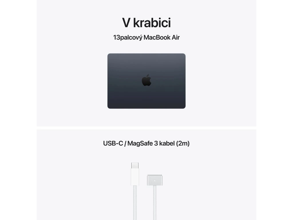 Apple MacBook Air 13'' s čipem M5 *Apple Intelligence Operační systém: macOS Procesor: Apple M5, 10jádrové CPU (4P+6E), 10jádrové GPU, 16jádrový Neural Engine, propustnost paměti 153 GB/s Paměť: 16GB Pevný disk: 1TB SSD Optická mechanika: ne Čtečka paměťových karet: ne Displej: 13,6'' Liquid Retina IPS, 2560×1664 při 224 pixelech na palec, LED podsvícení, 500 nitů, True Tone Audio: 4x reproduktor, Dolby Atmos, 3x mikrofon Webkamera: 12Mpx Center Stage, 1080p HD video Polohovací zařízení: Force Touch trackpad Podsvícená klávesnice: ano Layout klávesnice: CZ Numerická klávesnice: ne Čtečka otisků prstů: Touch ID Síť: ne Bezdrátová komunikace: Wi-Fi 7 (802.11be) + Bluetooth 6 Porty USB: *2x Thunderbolt/USB 4 (nabíjení, DisplayPort, Thunderbolt 4: až 40Gb/s, USB4: až 40Gb/s) Ostatní porty: *1x MagSafe 3 *1x 3,5mm sluchátkový konektor Baterie: vestavěná 66,5Wh lithium-polymerová Výdrž baterie: až 15 hodin bezdrátového prohlížení webu Napájení: napájecí adaptér se prodává zvlášť (minimální příkon potřebný k nabíjení zařízení je 35 W) Barva: temně inkoustová Rozměry: 304,1x215x11,3mm Hmotnost: 1,23kg V krabici: *13'' MacBook Air *USB-C/MagSafe 3 kabel (2m) *CZ návod součástí balení Záruka: 1 rok