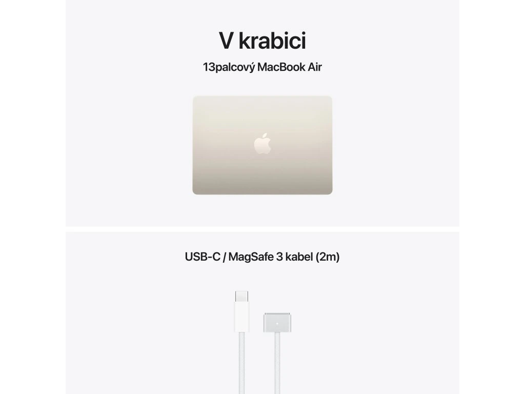 Apple MacBook Air 13'' s čipem M5 *Apple Intelligence Operační systém: macOS Procesor: Apple M5, 10jádrové CPU (4P+6E), 8jádrové GPU, 16jádrový Neural Engine, propustnost paměti 153 GB/s Paměť: 16GB Pevný disk: 512GB SSD Optická mechanika: ne Čtečka paměťových karet: ne Displej: 13,6'' Liquid Retina IPS, 2560×1664 při 224 pixelech na palec, LED podsvícení, 500 nitů, True Tone Audio: 4x reproduktor, Dolby Atmos, 3x mikrofon Webkamera: 12Mpx Center Stage, 1080p HD video Polohovací zařízení: Force Touch trackpad Podsvícená klávesnice: ano Layout klávesnice: CZ Numerická klávesnice: ne Čtečka otisků prstů: Touch ID Síť: ne Bezdrátová komunikace: Wi-Fi 7 (802.11be) + Bluetooth 6 Porty USB: *2x Thunderbolt/USB 4 (nabíjení, DisplayPort, Thunderbolt 4: až 40Gb/s, USB4: až 40Gb/s) Ostatní porty: *1x MagSafe 3 *1x 3,5mm sluchátkový konektor Baterie: vestavěná 66,5Wh lithium-polymerová Výdrž baterie: až 15 hodin bezdrátového prohlížení webu Napájení: napájecí adaptér se prodává zvlášť (minimální příkon potřebný k nabíjení zařízení je 35 W) Barva: hvězdně bílá Rozměry: 304,1x215x11,3mm Hmotnost: 1,23kg V krabici: *13'' MacBook Air *USB-C/MagSafe 3 kabel (2m) *CZ návod součástí balení Záruka: 1 rok