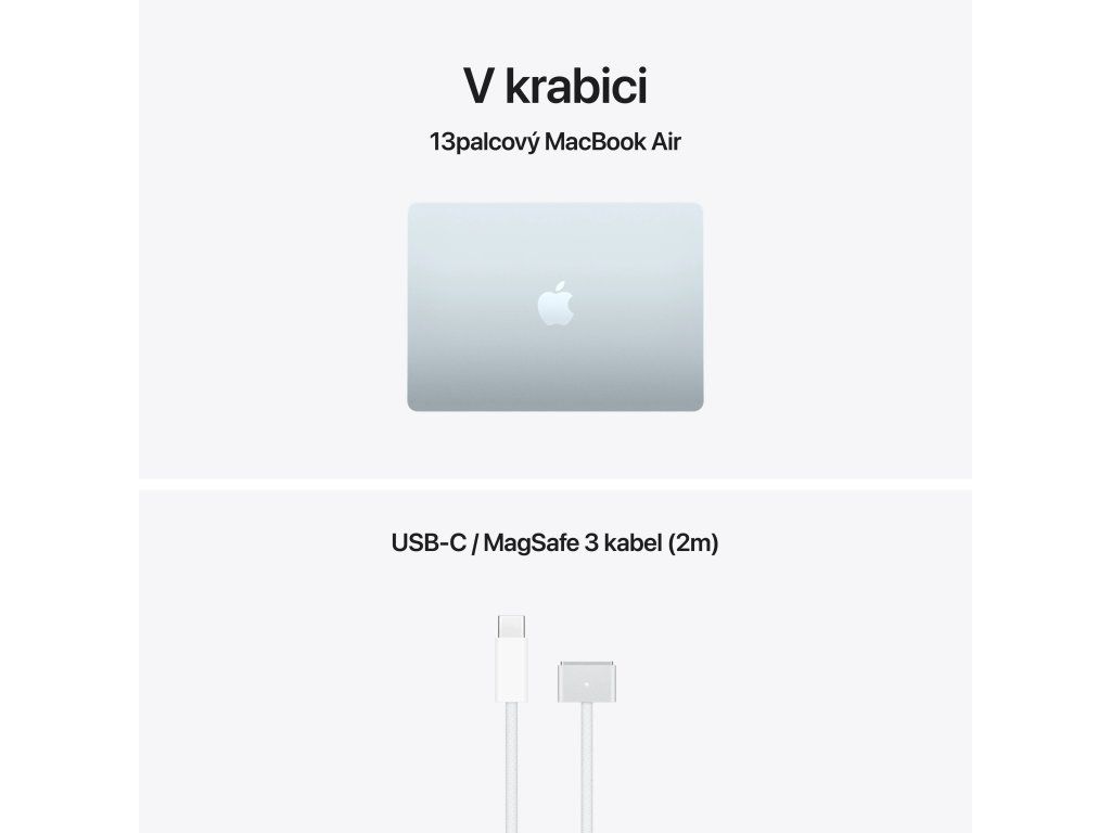 Apple MacBook Air 13'' s čipem M5 *Apple Intelligence Operační systém: macOS Procesor: Apple M5, 10jádrové CPU (4P+6E), 10jádrové GPU, 16jádrový Neural Engine, propustnost paměti 153 GB/s Paměť: 24GB Pevný disk: 1TB SSD Optická mechanika: ne Čtečka paměťových karet: ne Displej: 13,6'' Liquid Retina IPS, 2560×1664 při 224 pixelech na palec, LED podsvícení, 500 nitů, True Tone Audio: 4x reproduktor, Dolby Atmos, 3x mikrofon Webkamera: 12Mpx Center Stage, 1080p HD video Polohovací zařízení: Force Touch trackpad Podsvícená klávesnice: ano Layout klávesnice: CZ Numerická klávesnice: ne Čtečka otisků prstů: Touch ID Síť: ne Bezdrátová komunikace: Wi-Fi 7 (802.11be) + Bluetooth 6 Porty USB: *2x Thunderbolt/USB 4 (nabíjení, DisplayPort, Thunderbolt 4: až 40Gb/s, USB4: až 40Gb/s) Ostatní porty: *1x MagSafe 3 *1x 3,5mm sluchátkový konektor Baterie: vestavěná 66,5Wh lithium-polymerová Výdrž baterie: až 15 hodin bezdrátového prohlížení webu Napájení: napájecí adaptér se prodává zvlášť (minimální příkon potřebný k nabíjení zařízení je 35 W) Barva: ,blankytně modrá Rozměry: 304,1x215x11,3mm Hmotnost: 1,23kg V krabici: *13'' MacBook Air *USB-C/MagSafe 3 kabel (2m) *CZ návod součástí balení Záruka: 1 rok