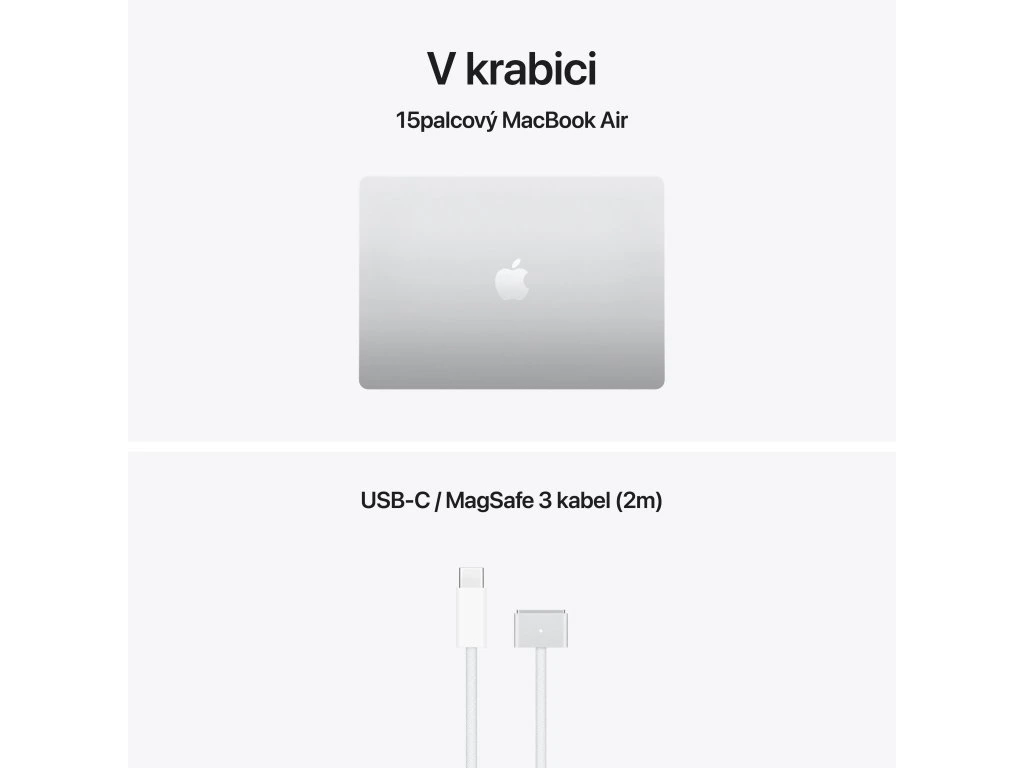 Apple MacBook Air 15'' s čipem M5 *Apple Intelligence Operační systém: macOS Procesor: Apple M5, 10jádrové CPU (4P+6E), 10jádrové GPU, 16jádrový Neural Engine, propustnost paměti 153 GB/s Paměť: 16GB Pevný disk: 1TB SSD Optická mechanika: ne Čtečka paměťových karet: ne Displej: 15,3'' Liquid Retina IPS, 2880×1864 při 224 pixelech na palec, LED podsvícení, 500 nitů, True Tone Audio: 6x reproduktor s wooferem, Dolby Atmos, 3x mikrofon Webkamera: 12Mpx Center Stage, 1080p HD video Polohovací zařízení: Force Touch trackpad Podsvícená klávesnice: ano Layout klávesnice: ,SK Numerická klávesnice: ne Čtečka otisků prstů: Touch ID Síť: ne Bezdrátová komunikace: Wi-Fi 7 (802.11be) + Bluetooth 6 Porty USB: *2x Thunderbolt/USB 4 (nabíjení, DisplayPort, Thunderbolt 4: až 40Gb/s, USB4: až 40Gb/s) Ostatní porty: *1x MagSafe 3 *1x 3,5mm sluchátkový konektor Baterie: vestavěná 66,5Wh lithium-polymerová Výdrž baterie: až 15 hodin bezdrátového prohlížení webu Napájení: napájecí adaptér se prodává zvlášť (minimální příkon potřebný k nabíjení zařízení je 140 W) Barva: stříbrná Rozměry: 340,4x237,6x11,5mm Hmotnost: 1,51kg V krabici: *15'' MacBook Air *USB-C/MagSafe 3 kabel (2m) *SK návod součástí balení Záruka: 1 rok