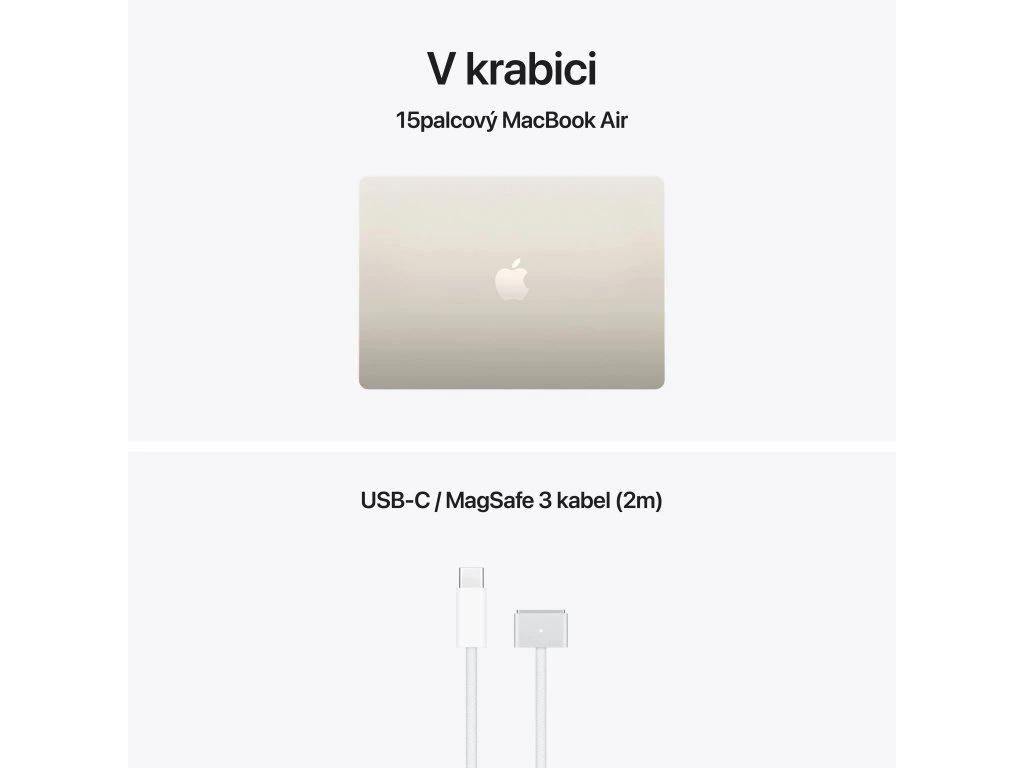 Apple MacBook Air 15'' s čipem M5 *Apple Intelligence Operační systém: macOS Procesor: Apple M5, 10jádrové CPU (4P+6E), 10jádrové GPU, 16jádrový Neural Engine, propustnost paměti 153 GB/s Paměť: 16GB Pevný disk: 1TB SSD Optická mechanika: ne Čtečka paměťových karet: ne Displej: 15,3'' Liquid Retina IPS, 2880×1864 při 224 pixelech na palec, LED podsvícení, 500 nitů, True Tone Audio: 6x reproduktor s wooferem, Dolby Atmos, 3x mikrofon Webkamera: 12Mpx Center Stage, 1080p HD video Polohovací zařízení: Force Touch trackpad Podsvícená klávesnice: ano Layout klávesnice: SK Numerická klávesnice: ne Čtečka otisků prstů: Touch ID Síť: ne Bezdrátová komunikace: Wi-Fi 7 (802.11be) + Bluetooth 6 Porty USB: *2x Thunderbolt/USB 4 (nabíjení, DisplayPort, Thunderbolt 4: až 40Gb/s, USB4: až 40Gb/s) Ostatní porty: *1x MagSafe 3 *1x 3,5mm sluchátkový konektor Baterie: vestavěná 66,5Wh lithium-polymerová Výdrž baterie: až 15 hodin bezdrátového prohlížení webu Napájení: napájecí adaptér se prodává zvlášť (minimální příkon potřebný k nabíjení zařízení je 140 W) Barva: ,hvězdně bílá Rozměry: 340,4x237,6x11,5mm Hmotnost: 1,51kg V krabici: *15'' MacBook Air *USB-C/MagSafe 3 kabel (2m) *SK návod součástí balení Záruka: 1 rok
