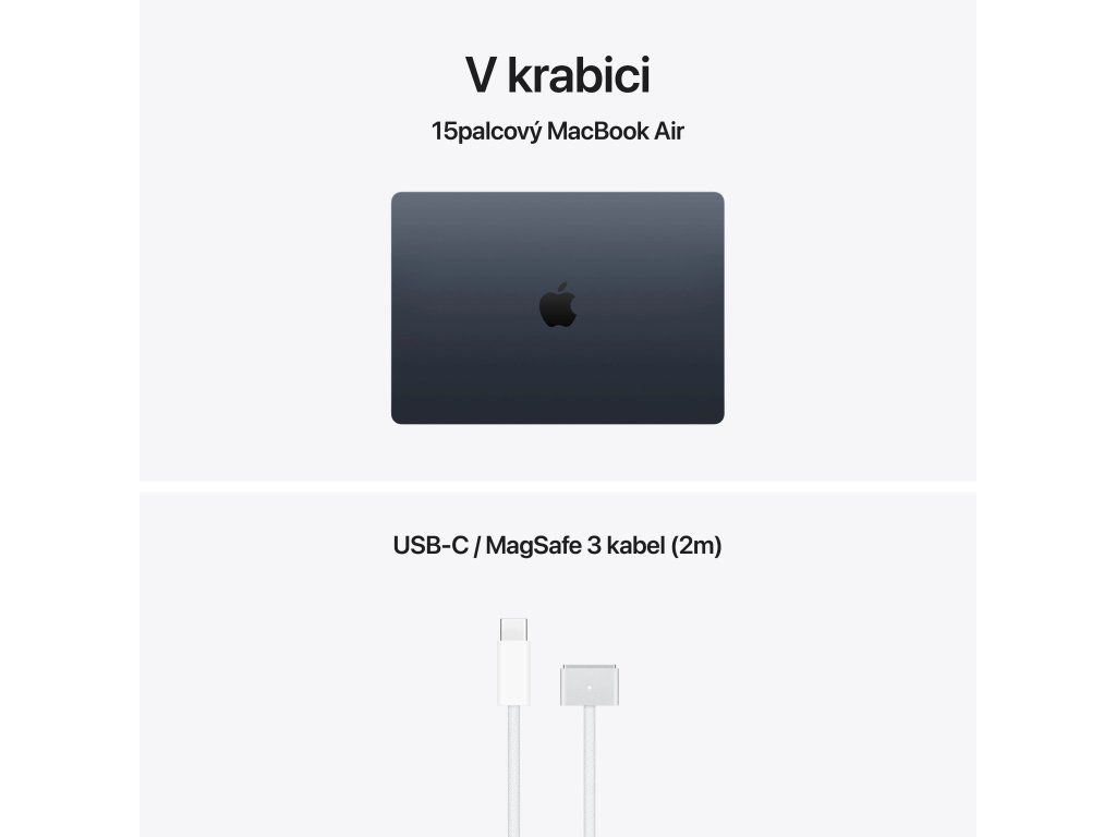 Apple MacBook Air 15'' s čipem M5 *Apple Intelligence Operační systém: macOS Procesor: Apple M5, 10jádrové CPU (4P+6E), 10jádrové GPU, 16jádrový Neural Engine, propustnost paměti 153 GB/s Paměť: 24GB Pevný disk: 1TB SSD Optická mechanika: ne Čtečka paměťových karet: ne Displej: 15,3'' Liquid Retina IPS, 2880×1864 při 224 pixelech na palec, LED podsvícení, 500 nitů, True Tone Audio: 6x reproduktor s wooferem, Dolby Atmos, 3x mikrofon Webkamera: 12Mpx Center Stage, 1080p HD video Polohovací zařízení: Force Touch trackpad Podsvícená klávesnice: ano Layout klávesnice: CZ Numerická klávesnice: ne Čtečka otisků prstů: Touch ID Síť: ne Bezdrátová komunikace: Wi-Fi 7 (802.11be) + Bluetooth 6 Porty USB: *2x Thunderbolt/USB 4 (nabíjení, DisplayPort, Thunderbolt 4: až 40Gb/s, USB4: až 40Gb/s) Ostatní porty: *1x MagSafe 3 *1x 3,5mm sluchátkový konektor Baterie: vestavěná 66,5Wh lithium-polymerová Výdrž baterie: až 15 hodin bezdrátového prohlížení webu Napájení: napájecí adaptér se prodává zvlášť (minimální příkon potřebný k nabíjení zařízení je 140 W) Barva: temně inkoustová Rozměry: 340,4x237,6x11,5mm Hmotnost: 1,51kg V krabici: *15'' MacBook Air *USB-C/MagSafe 3 kabel (2m) *CZ návod součástí balení Záruka: 1 rok