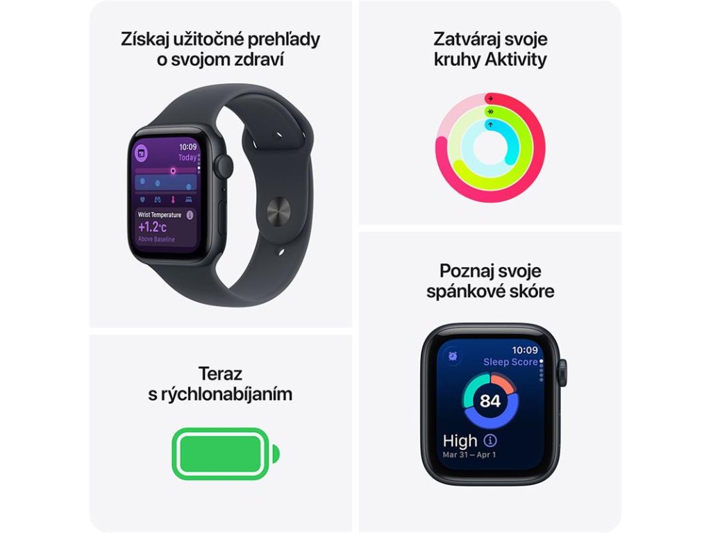 Apple Watch SE 3 sú plné základných funkcií pre zdravie, fitness, pripojenie a bezpečnosť - to všetko za skvelú cenu. Sledujte svoje skóre spánku. Získajte bohatšie zdravotné informácie v aplikácii Vitals. Zostaňte aktívni so širokou škálou cvičení. Ušetrite čas vďaka rýchlemu nabíjaniu. Pozrite si svoje informácie na prvý pohľad vďaka displeju Always-On. A stále získajte celodennú, 18-hodinovú výdrž batérie.