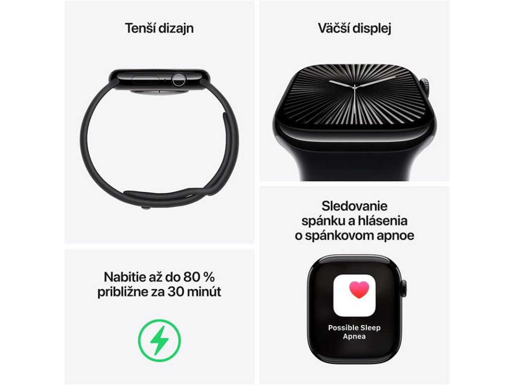 PREČO APPLE WATCH 10 - Väčší displej s až o 30 percent väčšou plochou obrazovky.Tenší, ľahší a pohodlnejší dizajn. Pokročilé funkcie pre zdravie a kondíciu poskytujú neoceniteľné informácie. Bezpečnostné funkcie vám pomôžu, keď to potrebujete. Rýchlejšie nabíjanie vám poskytne 80 percent batérie za približne 30 minút.