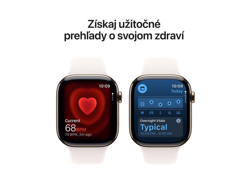 VIAC INFORMÁCIÍ O ZDRAVÍ— Kedykoľvek si urobte EKG. Dostávajte upozornenia na vysokú a nízku srdcovú frekvenciu, nepravidelný rytmus a možnú spánkovú apnoe. Pozrite si nočné zdravotné metriky pomocou aplikácie Vitals a odčítajte si hodnoty kyslíka v krvi.
