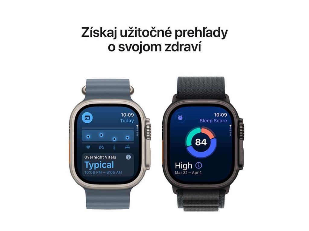 CENNÉ INFORMÁCIE O ZDRAVÍ— Dostávajte upozornenia na možnú hypertenziu, nepravidelný srdcový rytmus, spánkové apnoe alebo nezvyčajne vysokú alebo nízku srdcovú frekvenciu. Sledujte svoje skóre spánku a svoj denný zdravotný stav pomocou aplikácie Vitals a merajte hladinu kyslíka v krvi.