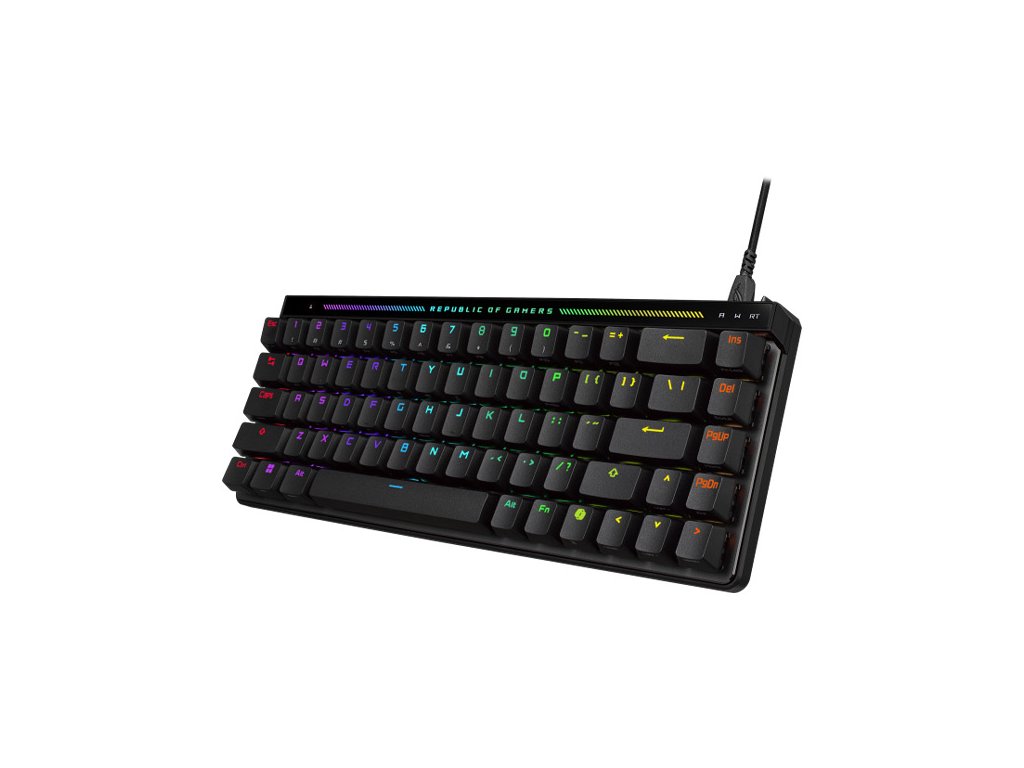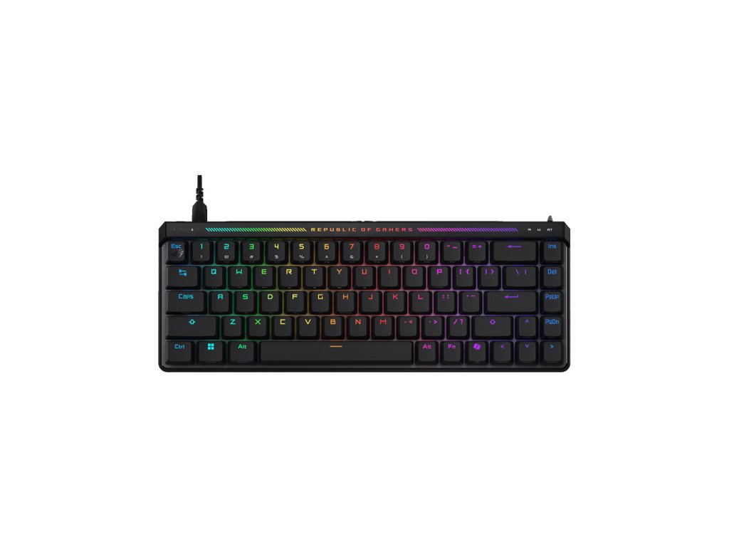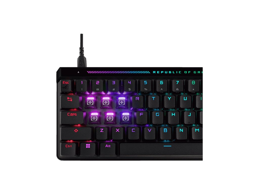 Kompaktná 65% herná klávesnica s ROG HFX magnetickými spínačmi, nastaviteľným aktivačným bodom 0.1-4.0 mm, 8000 Hz polling rate, dotykovým panelom a multifunkčným tlačidlom pre rýchle nastavenie, dvojitými USB-C portami a výnimočne rýchlou reakciou vďaka technológii Rapid.