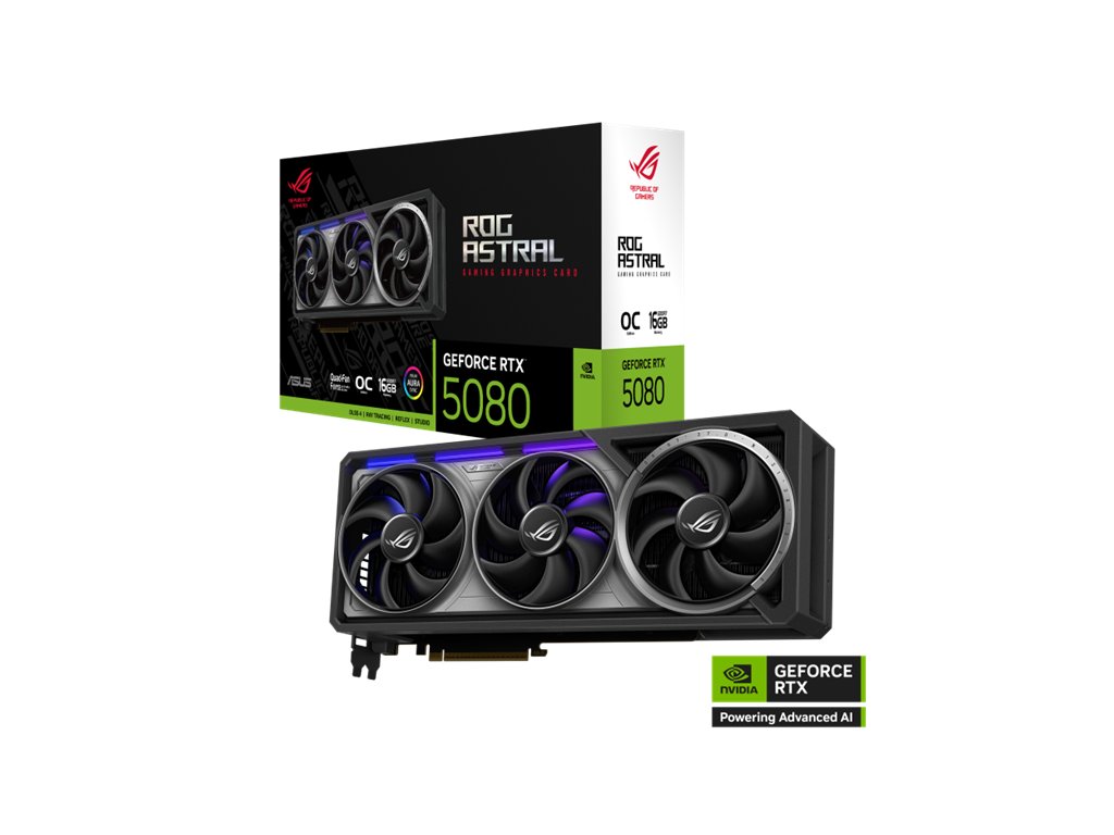 V tomto duchu ROG Astral GeForce RTX 5080 predstavuje prvú grafickú kartu ROG so štyrmi ventilátormi spojenú s patentovanou parnou komorou, zvýšenou hustotou chladiča, tepelnou podložkou GPU so zmenou fázy, vysokými predvolenými rýchlosťami hodín, zvýšeným výkonom a ďalšími funkciami..