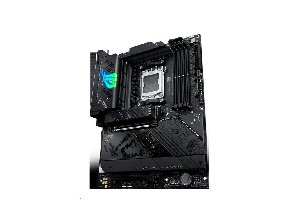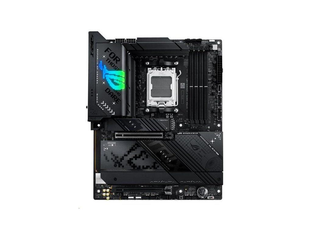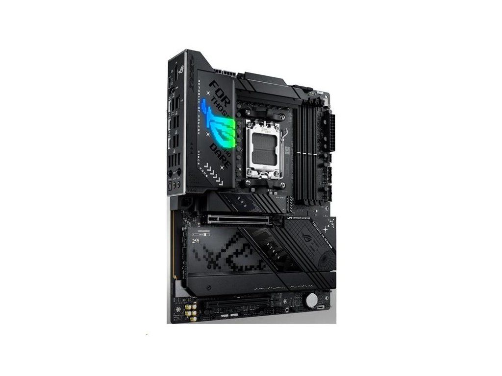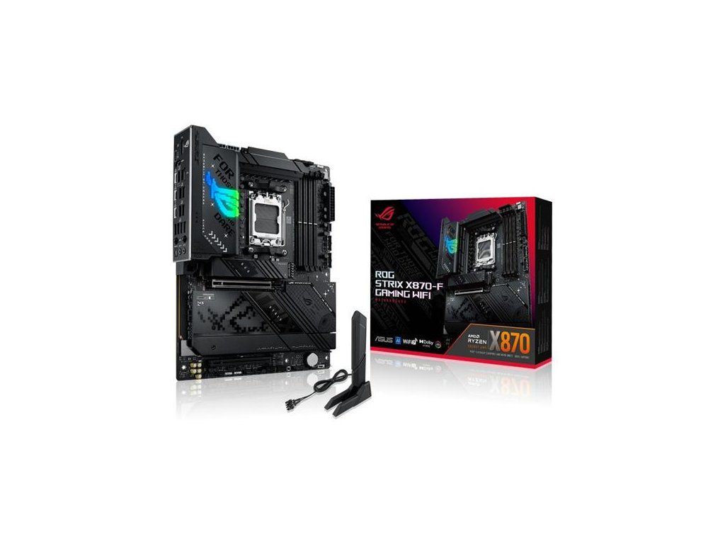 Základná doska AMD X870 formátu ATX so 16+2+2 fázami napájania, Dynamic OC Switcher, Core Flex, podpora DDR5 s AEMP, WiFi 7 s ASUS WiFi Q-Antenna, štyri sloty M.2, PCIe® 5.0 x16 SafeSlots Slot Q-Release Slim, dva porty USB4®, USB 10Gb/s Type-C® s PD 3.0 až 30 W, AI Overclocking, AI Cooling II, AI Networking II a osvetlenie Aura Sync RGB.