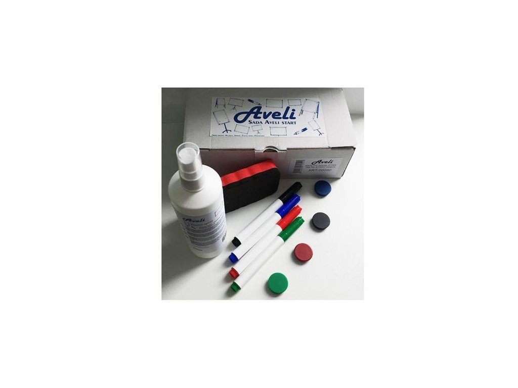 "Základní sada pomůcek k popisovacím tabulím. Sada obsahuje: 4 barevné popisovače na bílé tabule, čistící 250 ml sprej, 6 kulatých magnetů o průměru 24mm , 1 magnetická stěrka.