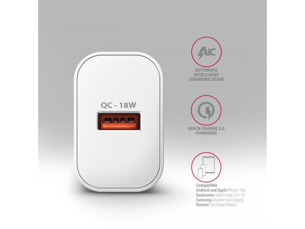 Nabíječka je vybavena výstupem Quick Charge 3.0 USB typu A, což umožňuje rychlé nabíjení smartphonů a tabletů výkonem až 18W. Adaptér je také kompatibilní s dalšími standardy rychlého nabíjení telefonů, jako jsou Apple iPhone, iPad, Samsung, Huawei, Honor, Xiaomi, Motorola a dalších.