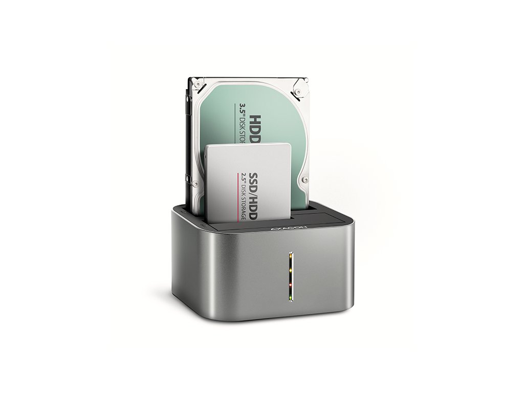 SuperSpeed USB-C 5Gbps dokovací / klonovací stanice AXAGON ADSA-DC DUAL CLONE připojí k počítači snadno a rychle až dva 2.5'' nebo 3.5'' disky současně. Připojení k počítači umožňuje moderní oboustranný USB-C konektor na doku spolu s dodávaným kabelem USB-C <-> USB-A o délce 80 cm. Tento šikovný pomocník vám tak umožní nejjednodušší připojení 2.5''/3.5'' SATA disků k počítači nebo notebooku. Jeden nebo i dva disky současně jen stačí zasunout do základny, nejsou potřeba žádné nástroje ani doplňky. Výměna disků je tak velmi rychlá a jednoduchá. Dokovací stanici také využijete pro snadné klonování obsahu připojených disků bez potřeby připojení k PC. Do prvního slotu stanice HDD A (source) zasunete zdrojový disk a do druhého slotu HDD B (target) zasunete cílový disk. Pak jen zmáčknete klonovací tlačítko a sledujete průběh klonování na stupnici čtyř LED diod. Po zkopírování všech dat je na cílovém disku přesná kopie původního disku. Dock tak lze využít jako autonomní zařízení pro pohodlné duplikování a vytváření obrazů disků. Jedná se o nejjednodušší způsob, jak přenést obsah starého HDD disku na nový SSD disk, a to včetně funkčního operačního systému (Windows, macOS, Linux …). Rozhraní SATA 6G s podporou UASP dovolí užívat si rychlost moderních SSD disků. Podpora funkce TRIM pro omezení pozvolné degradace výkonu SSD v čase. Stanice umožňuje čtení S.M.A.R.T. informací monitorujících kondici HDD/SSD. Podporuje usínání připojených disků i stanice. Skříň stanice je dostatečně robustní a odolná, což umožňuje dokonalou stabilitu i s vloženými disky. Gumové nožky omezují posouvání po stole a vibrace pevných disků. Vnější plášť je proveden z hliníku s elegantním broušeným povrchem. Vstup: • USB-C 5Gbps (USB 3.2 Gen 1 / USB 3.0). • Rychlost až 5 Gbit/s. • Připojení přes USB-C female konektor. Podpora zařízení: • Rozhraní SATA III - 6 Gb/s (600 MB/s). • Podpora 2.5'' HDD/SSD • Podpora 3.5'' HDD. • Max. kapacita disku - všechny bez omezení. • Max. výška 2.5'' disku - všechny bez omezení. Vlastnosti: • Kompatibilní s USB 3.2 Gen 2 (USB 3.1 Gen 2) a zpětně kompatibilní s USB 2.0. • Podpora přenosových rychlostí 5000 / 480 Mbit/s. • Vyhovuje Serial ATA 3.0 specifikaci (SATA/600), přenosové rychlosti až 6 Gb/s (600 MB/s). • Vyhovuje Serial ATA 2.0 specifikaci (SATA/300), přenosové rychlosti až 3 Gb/s (300 MB/s). • Vyhovuje Serial ATA 1.0 specifikaci (SATA/150), přenosové rychlosti až 1.5 Gb/s (150 MB/s). • Celková propustnost / přenosová rychlost stanice je dána použitým USB rozhraním (teor. 5 Gbit/s). • Vyhovuje USB Mass Storage Class specifikaci. • Podpora BOT (Bulk-Only Transport). • Podpora UASP (USB Attached SCSI Protocol) pro rychlejší přenos dat ve Windows 8 a novějších. • Podpora funkce TRIM pro omezení pozvolné degradace výkonu SSD v čase. • Podpora S.M.A.R.T. (Self-Monitoring, Analysis, and Reporting Technology) systém monitorující stav disku. • Podpora bootování z HDD/SSD v dokovací stanici. • Možnost připojení zařízení za chodu díky podpoře Hot Plug. • Plná podpora Plug and Play. • HDD Auto Spin down - vypínání disků při nečinnosti. • HDD Turn Off - vypnutí disku po odebrání zařízení nebo uspání PC. • Připojení přes USB-C female konektor. • Kabel USB-C <-> USB-A délky 80 cm je součástí balení. • LED indikující napájení HDD/SSD docku a aktivitu disků v obou šachtách. • Rozměry stanice 130 x 97 x 73 mm. • Hmotnost 307 g. Napájení: • Napájení pomocí přiloženého externího AC/DC adapteru 12V – 2.5A (30W) s kabelem délky 150 cm. • Vypínač napájení. Funkce klonování obsahu disku: • Klonování probíhá bez připojení stanice k počítači. • Cílový disk musí mít stejnou nebo větší kapacitu jako disk zdrojový, jinak nelze klonování spustit. • Klonovat lze jak pevné disky HDD tak SSD. • Rychlost klonování SSD až 300 MB/s. • Celkový čas naklonování disku závisí na kapacitě zdrojového disku, ne na objemu dat na disku. Podporované operační systémy: • Windows, macOS, Linux, Chrome OS. Balení v kartonové krabičce obsahuje: • HDD/SSD dock, • USB-C <-> USB-A kabel délky 80 cm, • napájecí adapter 100-240V / 12V-2.5A, • vícejazyčný návod CZ/DE/DK/ENG/ESP/FIN/FR/GR/HR/HU/IT/NL/PL/PT/RO/RU/SK/SWE/BG/CN/TR/ARA.