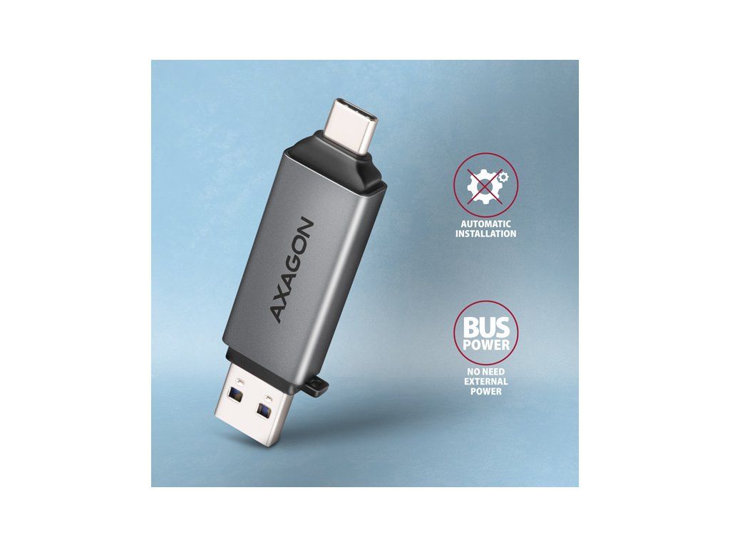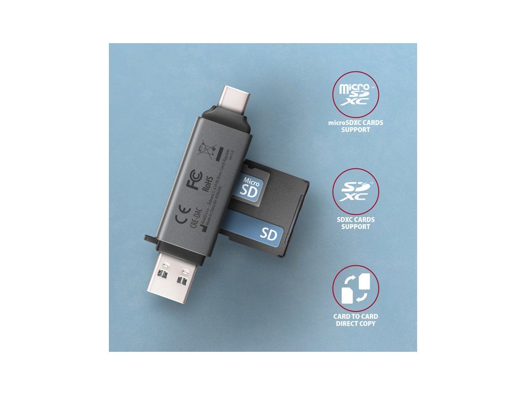AXAGON CRE-DAC, USB-C + USB-A, 5 Gb/s - MINI čítačka kariet, 2 sloty & lun SD/microSD, podpora UHS-I Axagon