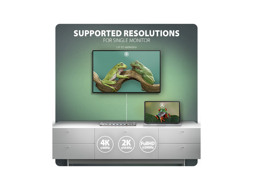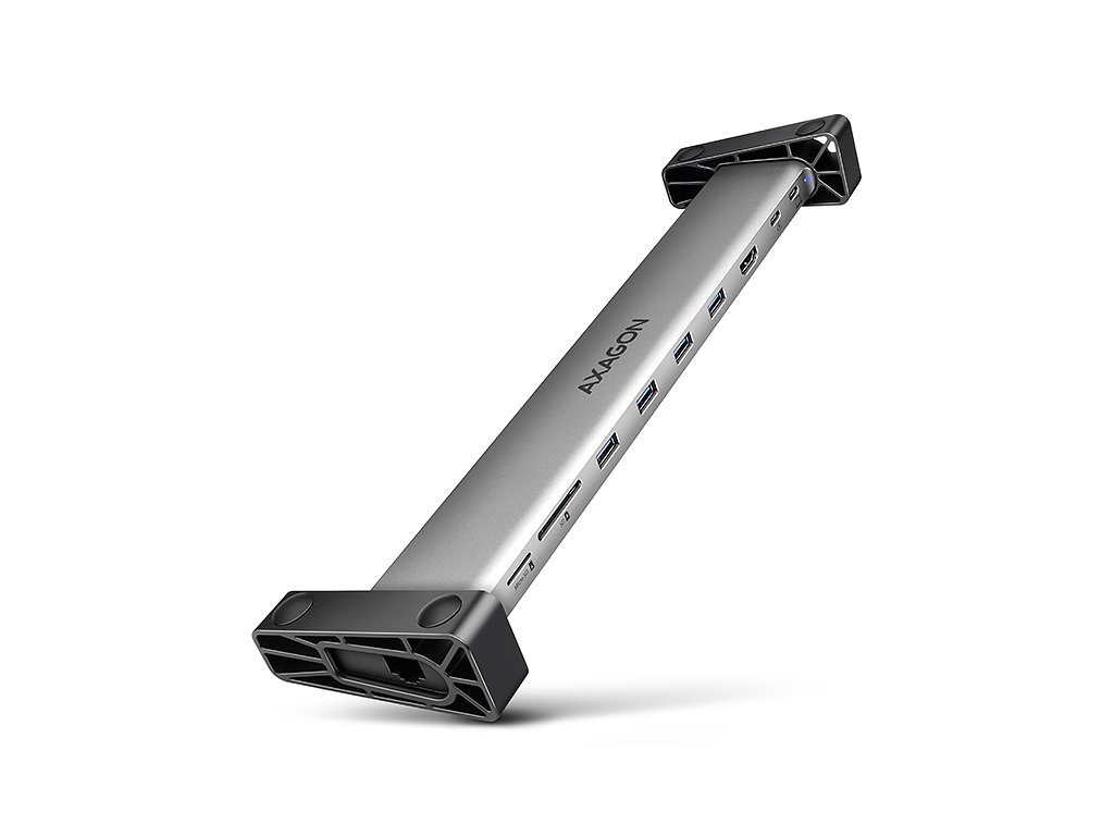 Multiportový USB-C 5Gbps AXAGON HMC-10HLS LONGER hub 9in1 rozšíří Váš notebook, počítač nebo telefon o devět portů. Přes oboustranný USB-C konektor snadno a rychle připojíte k počítači monitor, čtyři USB zařízení, Gigabitovou ethernet síť a čtečku SD karet. Zároveň získáte možnost napájení notebooku pomocí technologie Power Delivery. Replikátor portů vám tak poskytne jednoduchou a skladnou dokovací stanici 9v1 nejen k Windows notebookům ale i Apple notebookům jako je například MacBook Air nebo MacBook Pro. USB rozbočovač nabízí čtyři USB výstupy o rychlosti 5Gbps se standardním USB-A konektorem. Hub také zvládne trvalé připojení až tří externích disků současně. Díky rychlému USB 3.2 Gen 1 rozhraní je přenosová rychlost hubu až 5Gb/s. Hub také dokáže nabíjet mobilní telefony a tablety připojené do USB portů hubu proudem až 1.5A/5V. Z hubu tak snadno nabijete např. Android smartphone, Apple iPhone, Apple iPad apod. Jeden z USB-C konektorů slouží k propojení s notebookem přiloženým 25 cm dlouhým kabelem s reversibilním USB-C konektorem na obou koncích. Druhý USB-C konektor je vyhrazen pouze pro nabíjení telefonů nebo notebooků pomocí technologie Power Delivery 3.0 výkonem až 100W. Do hubu zapojíte vhodnou USB-C Power Delivery nabíječku a hub připojíte k notebooku s podporou Power Delivery. Tím také uvolníte jeden USB-C port. HDMI výstup poskytuje kvalitní obraz v rozlišení až 4K/60Hz Ultra HD a podporuje přenos vícekanálového zvuku. Podporovány jsou také vysoké frekvence v oblíbených hráčských rozlišeních 2K/144Hz nebo FullHD/240Hz. Díky podpoře HDR (vysoce dynamický rozsah) si můžete bez omezení vychutnat výrazně rozšířený rozsah barev a kontrastů. Pro správné fungování video výstupů je nutné, aby notebook měl USB-C port s podporou DisplayPort Alternate Mode (DP Alt Mode) nebo port Thunderbolt 3 a výše. Gigabitová síťová karta rozšíří počítač o rychlé a stabilní síťové připojení, doplní chybějící síťový RJ-45 Ethernet konektor, nebo přidá další síťovou kartu. Čtečka karet podporuje všechny verze SD a microSD karet včetně SDXC a microSDXC s kapacitou až 2TB. Card reader umožňuje současnou práci s kartami v obou slotech a přímé kopírování mezi nimi. Elegantní hliníkové tělo zajistí nejen mechanickou odolnost, ale i pasivní chlazení. Součástí balení jsou nástavce, které umožní hub použít jako podložku pod notebook, která zajistí lepší chlazení díky většímu proudění vzduchu pod notebookem. Zároveň vylepší ergonomii na vašem pracovišti. Díky funkcím Plug and Play a Hot Plug je samotné zapojení hubu velmi jednoduché bez složité instalace, a také lze jednoduše připojovat a odpojovat periferie za běhu počítače. Rozbočovač se nezalekne ani připojení k telefonům s USB-C konektorem. K telefonu tak připojíte například flash disk, klávesnici, myš, monitor, TV nebo projektor. Vstup (připojení k notebooku): • USB 5Gbps (USB 3.2 Gen 1 / USB 3.0), konektor USB-C female. • Kompatibilní s USB 3.2 Gen 2, USB4 a Thunderbolt 3/4. Vstup: (napájení): • USB Power Delivery 3.0 - 100W port (jen napájení), konektor USB-C female. • Napájení notebooku ze síťového adaptéru přes USB-C hub. • Napájení PD musí podporovat jak notebook (telefon), tak síťová nabíječka. Výstupy USB: • 4x USB 5Gbps port, konektor USB-A female. • USB-C hub zvládne připojení dvou externích disků současně. • Nabíjení mobilních zařízení (včetně iPad) proudem až 1.5A z USB-A a USB-C portů hubu. Video výstup: • 1x HDMI port, konektor HDMI A female. • 4K rozlišení 4096 x 2160 při až 60Hz. • 2K / WQHD rozlišení 2560 x 1440 při až 120Hz. • FHD rozlišení 1920 x 1080 při až 240Hz. • Podpora výše uvedených max. rozlišení a frekvencí vyžaduje připojení k počítači s DisplayPort verze 1.4. • Pro funkci video výstupu je nutné hub zapojit do USB-C portu s podporou DisplayPort Alternate Mode (DP Alt Mode) nebo do USB-C portu s podporou Thunderbolt 3/4. Dále je nutný vhodný OS. Bez této podpory nebude funkce video výstupu dostupná. • Podpora HDR (High dynamic range, 10 bit support) - realistická reprodukce světlých a tmavých detailů. • Podpora HPD (Hot-Plug-Detect). • Podpora TMDS (Transition Minimized Differential Signaling). • Plná podpora HDCP 1.4 a 2.3 (High-bandwidth Digital Content Protection). • Podpora 2kanálového zvuku vzorkovací frekvence až 192 kHz a až 24bitového zvuku – závisí na zdrojovém a koncovém zařízení, tj. notebooku/telefonu a TV/monitoru/AV receiveru. Výstup RJ-45: • Rozhraní Gigabit Ethernet s RJ-45 konektorem pro připojení UTP nebo STP kabelem. • Podporované přenosové rychlosti Ethernet rozhraní 10/100/1000 Mb/s. • Podporované specifikace IEEE 802.3 10Base-T, IEEE 802.3u 100Base-TX, IEEE 802.3ab 1000Base-T. • 10/100/1000 Mb/s autodetekce. • Podpora funkce Wake-on-LAN. Čtečka karet - dva sloty: • Slot Micro SD: microSD / microSDHC / microSDXC / TransFlash. • Slot SD: SecureDigital / SDHC / SDXC, MultiMedia Card, MMC, MMC Dual Voltage, MMC mobile, RS-MMC, s adaptérem - miniSD, microSD / microSDHC / microSDXC, MMC Micro. • Podpora UHS-I. Rychlost až 104 MB/s. Podpora hardware ECC funkce a CRC funkce. • 2 LUN - čtečka se indikuje jako dvě diskové jednotky. Možnost kopírování z karty na kartu. Další vlastnosti: • Možnost připojení zařízení za chodu díky podpoře Hot Plug. • Plná podpora Plug and Play. • Podpora úsporného režimu. • Napájení přes USB sběrnici - USB bus power nebo z PD nabíječky. • Odolné hliníkové tělo pro lepší chlazení hubu. • LED indikuje trvalým svitem připojení hubu k počítači. • Kvalitní stíněný kabel zaručuje vysokou rychlost komunikace a minimální než