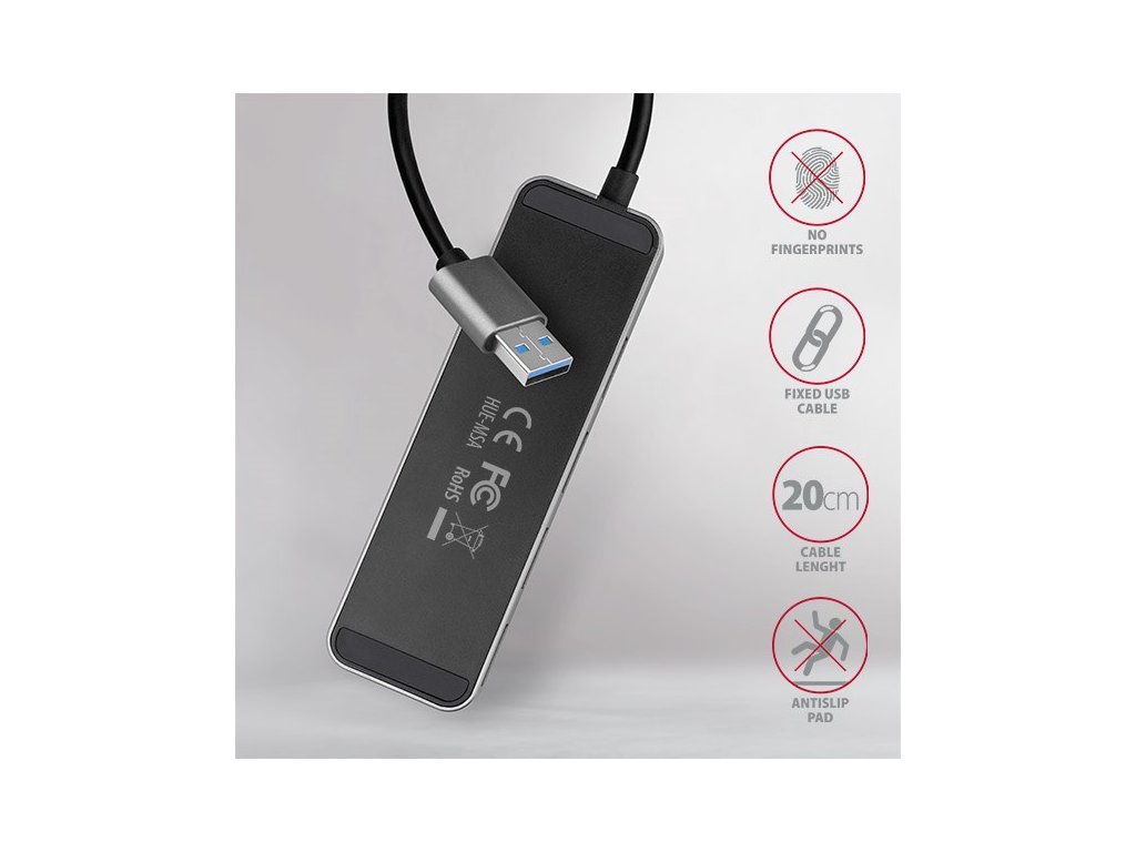 AXAGON HMA-GL3A, USB 3.2 Gen 1 hub, porty 3x USB-A + Gigabit Ethernet, kovový, kabel USB-A 20cm Axagon