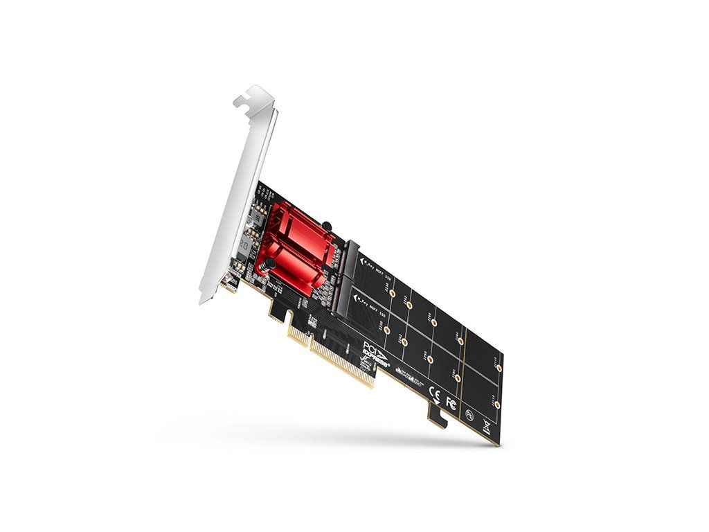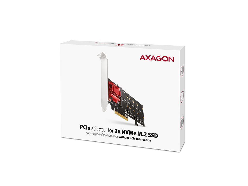 PCI-Express řadič AXAGON PCEM2-ND umožňuje připojení dvou NVMe M.2 SSD disků do stolního počítače a vytvoření pole RAID. Kvalitní zpracování, kompaktní rozměry a promyšlený design dělají z adaptéru ideální volbu pro upgrade stolního počítače, který není vybaven M.2 slotem. Poslouží také v případě nedostatku M.2 slotů. Redukce je univerzální a kompatibilní s jakoukoliv základní deskou a bude fungovat i v základních deskách bez podpory PCI-Express bifurkace. Za touto unikátní funkčností stojí kvalitní čip společnosti Asmedia. Díky PCI-Express 3.0 rozhraní kompatibilním s x8 a x16 sloty je možno dosáhnout maximálních přenosových rychlostí disků až 4000 MB/s (4 GB/s). Řadič podporuje použití NVMe (PCI-Express) M.2 SSD disků, jednostranných i oboustranných. Redukce nemá omezení kapacity SSD disků a lze použít pro M.2 disky až do rozměru 22x110 mm. Při osazení kratšími disky než 22110 lze zadní část karty oddělit a vejde se tak i do malého prostoru. Pro montáž adaptéru do nízko profilových skříní je přibalena low profile záslepka. Karta řadiče M.2 má také integrovaný zámek PCI-Express slotu sloužící pro lepší uchycení v PCIe slotu. Zámek lze v případě potřeby snadno odlomit. PCIe adaptér podporuje SW RAID, který lze vytvořit pomocí vhodného software nebo využitím integrovaných nástrojů v operačním systému. Nastavením RAID 1 docílíte efektivní ochrany dat pomocí zrcadlení. Chlazení čipu obstarává výkonný pasivní chladič. Pro chlazení M.2 disků lze použít chladiče se šířkou do 22 mm, vhodné jsou AXAGON M.2 chladiče CLR-M2L3, CLR-M2L6 a CLR-M2L10. LED indikace signalizuje zapojení nebo přenos dat v M.2 slotu. Instalace je zcela automatická, zvládne ji každý. Vstup: • Rozhraní PCI-Express 3.0, kompatibilní verze PCI-Express 4.0 / 3.0 / 2.1 / 2.0 / 1.1 / 1.0a. • Počet linek 8-Lane, kompatibilní s x8 / x16 PCIe sloty. Výstup: • 2x NGFF 75-pinový M-key slot pro montáž NVMe (PCI-Express) M.2 SSD disku. Další vlastnosti: • Plná podpora Plug and Play. • Souběžné fungování obou disků i na základních deskách bez podpory PCIe Bifurcation. • Podpora M.2 disků všech rozměrů - 2230, 2242, 2260, 2280 a 22110 mm. • Oddělitelná zadní část karty umožní použití i v malých prostorech. V tomto případě nelze přichytit 22110 disk. • Podpora M key nebo B+M key NVMe (PCI-Express) M.2 SSD disků bez omezení maximální kapacity. • Podpora jednostranných i oboustranných M.2 disků. • Podpora bootování z SSD karet. • Reálná propustnost / přenosová rychlost je cca 3500 MB/s (3.5 GB/s) a je dána limity PCI-Express 3.0 rozhraní. • Podpora SW RAID - umožňuje vytvořit softwarový RAID pomocí vhodného SW nebo nástrojů v operačním systému. • Integrovaný zámek PCI-E slotu pro lepší uchycení karty. V případě potřeby lze odlomit. • Možnost montáže chladičů na disky v obou slotech. Max. šířka chladiče je 22 mm - kompatibilní s AXAGON chladiči CLR-M2L3, CLR-M2L6 a CLR-M2L10. • Není potřeba instalace žádných ovladačů. • Adaptér je napájen přímo z PCI-Express sběrnice, není nutné externí napájení. • Dvojitá LED indikace signalizuje zapojení nebo přenos dat v M.2 slotech. • Rozměry 180 x 64 x 20 mm. • Hmotnost 75 g. Podporované operační systémy: • MS Windows 7 / 8 / 8.1 / 10 / 11 a novější, Windows Server 2008 R2 / 2012 / 2016 / 2019 / 2022 a novější (podporovány všechny 32- i 64-bitové verze OS Windows), Linux s jádrem 2.6.31 a vyšším. • Pozn.: Při použití Windows 7 je nutné ověřit u výrobce M.2 SSD disku podporu tohoto OS. Balení v kartonové krabičce obsahuje: • PCI-Express adaptér se standardní záslepkou, • low profile záslepku, • montážní materiál, • tištěný instalační návod CZ/DE/DK/ENG/ESP/FIN/FR/GR/HR/HU/IT/NL/PL/PT/RO/RU/SK/SWE/TR/BG/CN/ARA.