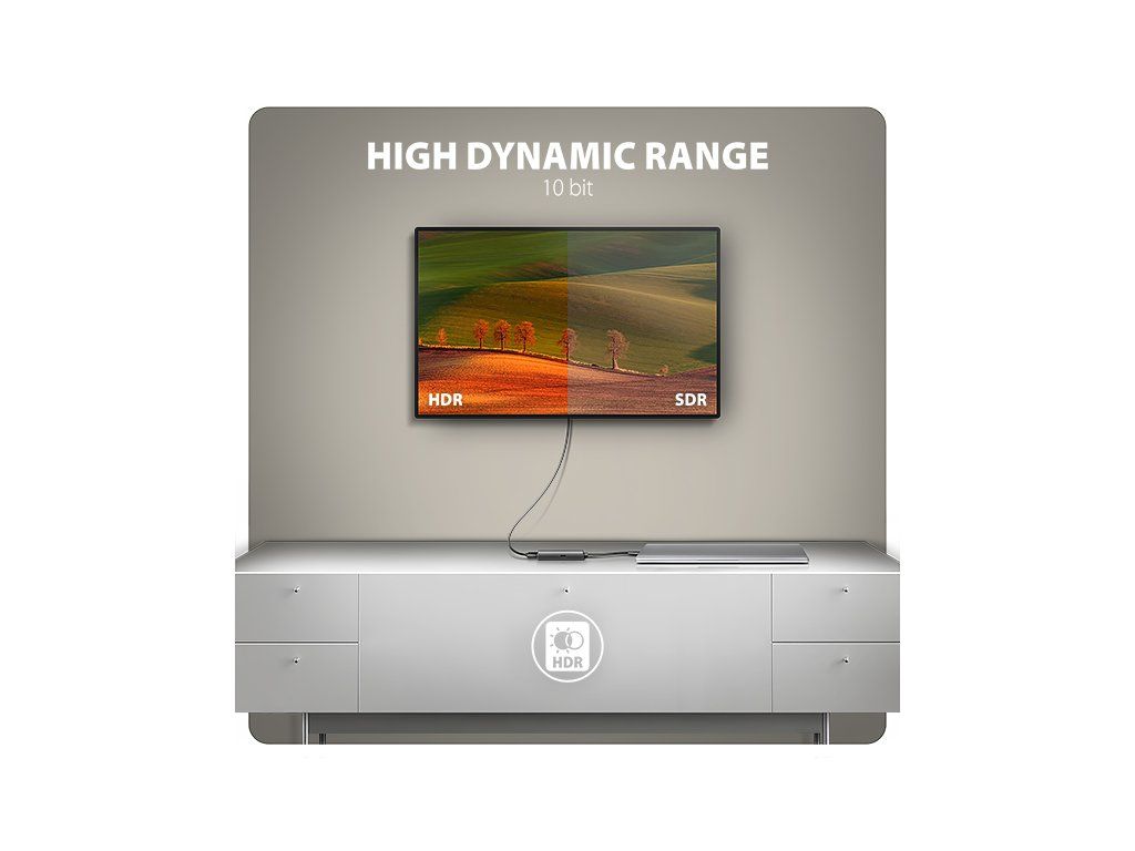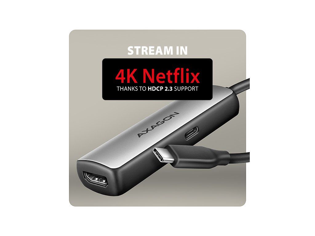 USB-C -> HDMI aktivní adaptér - redukce AXAGON RVC-HI8KPD pro připojení HDMI monitoru/TV/projektoru k notebooku, tabletu nebo telefonu s výstupem USB-C. Tato redukce vám umožní snadno využít váš stávající HDMI kabel k připojení zařízení jako Apple MacBook Air nebo Pro. Tento kompaktní hardwarový převodník nevyžaduje žádnou instalaci a zajišťuje vynikající obraz až do rozlišení 8K/60 Hz Ultra HD. Podpora 8K rozlišení vám umožní sledovat videa v úchvatné kvalitě, zatímco vysoké frekvence HDMI zaručují špičkový zážitek při sledování filmů, videí nebo hraní her. K dispozici jsou také populární rozlišení jako 4K/144 Hz Ultra HD, 2K/240 Hz Quad HD nebo 1080p/240 Hz Full HD. Díky podpoře HDR (vysoce dynamický rozsah) si můžete užít širokou škálu barev a kontrastů bez jakýchkoliv kompromisů. Unikátní vlastností tohoto video adaptéru je USB-C PD konektor, určený výhradně pro nabíjení telefonů a notebooků technologií Power Delivery 3.0 s výkonem až 100 W. Stačí připojit kompatibilní USB-C nabíječku s podporou Power Delivery a propojit video adaptér s notebookem. Tím nejen zajistíte nabíjení, ale zároveň uvolníte jeden USB-C port na notebooku pro další použití. Plug and Play technologie je ideálním pomocníkem nejen pro profesionály, ale i pro domácí uživatele, kteří chtějí snadno a efektivně rozšířit své multimediální prostředí. Užijte si domácí kino až s 8K obrazem nebo využijte adaptér pro konference a prezentace. Skvěle se hodí do škol a interaktivních prostor, kde se počítače častěji propojují s HDMI zařízeními. Grafici a video tvůrci ocení detailní zobrazení. Adaptér je kompatibilní s monitory značek jako jsou Dell, HP, Lenovo, ASUS, Samsung, LG, Sony, MSI a další, což zaručuje jeho univerzálnost a spolehlivost. Díky podpoře HDCP 2.3 si můžete bez omezení vychutnat své oblíbené streamovací služby v 8K / 4K rozlišení, včetně Netflixu, Disney+, HBO Max, Amazon Prime či Apple TV+. Samozřejmostí je také podpora přenosu bezztrátového zvuku, který je nejlépe využitelný na moderních televizích. Podpora HDCP musí být zajištěna na všech propojených zařízeních i samotnou streamovací službou. Redukce je vyrobena z kvalitních materiálů, které zajišťují vysokou spolehlivost. Kabel i konektory jsou chráněny proti zalomení, což prodlužuje jejich životnost. Adaptér je vybaven 16cm flexibilním kabelem ze silikonového materiálu, který se vyznačuje vyšší ohebností, odolností a pohodlnějším používáním ve srovnání s běžnými kabely. Pro správné fungování převodníku je nutný USB-C port s podporou DisplayPort Alternate Mode (DP Alt Mode) nebo zařízení s Thunderbolt portem. Adaptér je pouze jednosměrný, tj. převodník z USB-C na HDMI, ne naopak. Vstup (připojení k počítači, tabletu nebo telefonu): • USB-C s podporou DisplayPort Alternate Mode (DP Alt Mode) nebo Thunderbolt 3/4/5. • konektor USB type C (M) male (samec) Vstup (napájení): • USB Power Delivery 3.0 - 100W port, konektor USB-C female. • Napájení notebooku ze síťového adaptéru přes USB-C konektor na video redukci. • Napájení PD musí podporovat jak notebook (tablet, telefon), tak síťová nabíječka. Výstup (připojení k monitoru / TV / projektoru): • HDMI v2.1 • konektor HDMI A (F) female (samice) Nejrozšířenější podporovaná rozlišení: • 8K/60 Hz Ultra HD • 4K/144, 60, 30 Hz Ultra HD • 2K/240, 144, 120, 100, 60 Hz Quad HD • 1080p/240, 144, 120, 100, 75, 60 Hz Full HD Další podporovaná rozlišení: Rozlišení a frekvence jsou dána použitým monitorem, grafickou kartou a také kabelem. • max. 7680 x 4320 (16:9) @60Hz UHD 8K • 6016 × 3384 (16:9) @60Hz 6K • 5120 x 2880 (16:9) @120Hz 5K • 5120 × 2160 (21:9) @120Hz 5K • 5120 × 1440 (32:9) @120Hz Dual QHD 5K • 4096 x 2160 (17:9) @144Hz DCI 4K • 3840 x 2160 (16:9) @144Hz UHD-1 4K (UHDTV) • 3840 x 1600 (21:9) UW 4K (Ultrawide 1600p) • 3840 x 1200 (32:10) 4K (Super ultrawide 1200p) • 3840 x 1080 (32:9) 4K (Super ultrawide 1080p) • 3440 x 1440 (21:9) UWQHD (Ultrawide 1440p) • 2560 x 2048 (5:4) QSXGA • 2560 x 1920 (4:3) • 2560 x 1600 (16:10) WQXGA • 2560 x 1440 (16:9) @240Hz QHD • 2560 x 1080 (21:9) UWFHD (Ultrawide 1080p) • 2048 x 1536 (4:3) QXGA • 2048 x 1152 (16:9) QWXGA • 1920 x 1440 (4:3) • 1920 x 1200 (16:10) WUXGA • 1920 x 1080 (16:9) @240Hz Full HD/1080p • 1856 x 1392 (4:3) • 1792 x 1344 (4:3) • 1680 x 1050 (16:10) WSXGA+ • 1600 x 1200 (4:3) UXGA • 1600 x 900 (16:9) HD+ • 1536 x 864 (16:9) • 1440 x 900 (16:10) WXGA+ • 1400 x 1050 (4:3) SXGA+ • 1366 x 768 (16:9) HD • 1360 x 768 (16:9) HD • 1280 x 1024 (5:4) SXGA • 1280 x 960 (4:3) SXGA- • 1280 x 800 (16:10) WXGA • 1280 x 768 (5:3) WXGA • 1280 x 720 (16:9) HD/WXGA/720p • 1280 x 600 • 1152 x 864 (4:3) XGA+ • 1024 x 768 (4:3) XGA • 800 x 600 (4:3) SVGA Další vlastnosti: • Podpora přenosu bezztrátového až 8-kanálového zvuku - 192kHz při 24-bitech. • Podpora DDC (Display Data Channel) - inteligentní nastavení rozlišení, frekvence a dalších parametrů dle zdrojového grafického čipu. • Podporované módy: zrcadlení plochy primárního monitoru (default nastavení), rozšíření plochy primárního monitoru. • Podpora HDR10, HDR10+ (High Dynamic Range, 10 bit support) - realistická reprodukce světlých a tmavých detailů. • Podpora HPD (Hot-Plug-Detect) - komunikační sekvence řídící připojování/odpojování zařízení za chodu. • Podpora TMDS (Transition Minimized Differential Signaling). • Podpora HDCP 2.3 (8K, 4K, QHD, FullHD) - zpětně kompatibilní s HDCP 2.2. a 1.4. • Podpora power saving módů s uspáváním řízeným zdrojovým zařízením (PC) i zobrazovacím zařízením (monitor/TV). • Napájení z USB-C - není potřeba žád