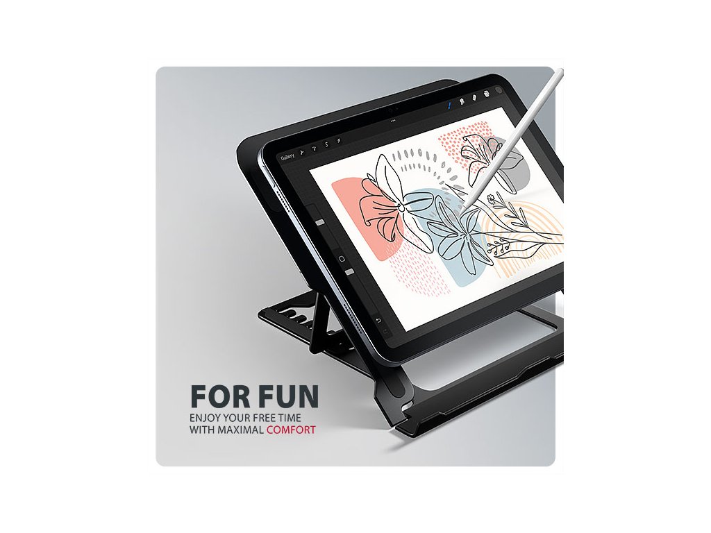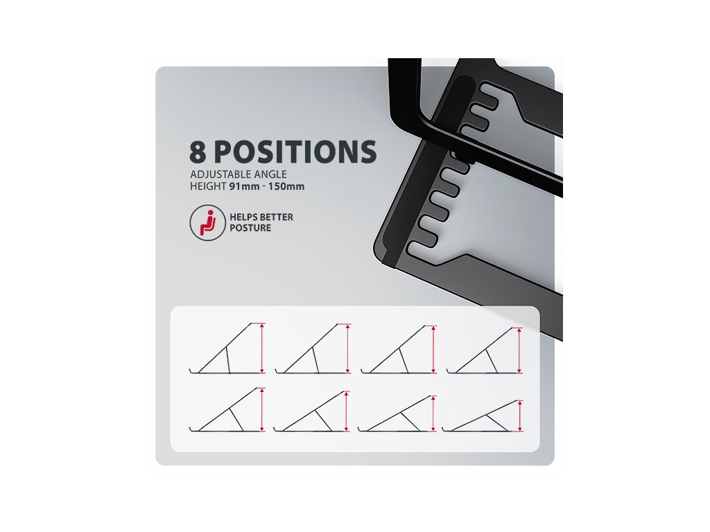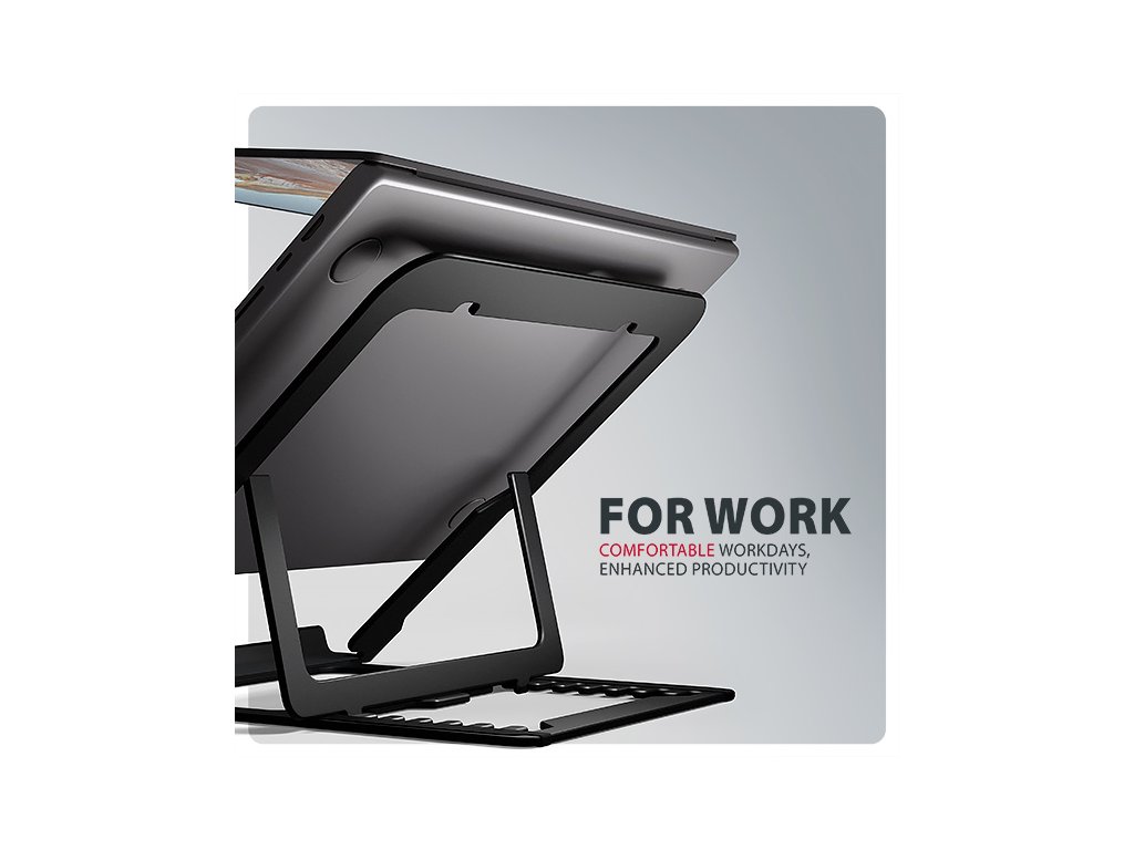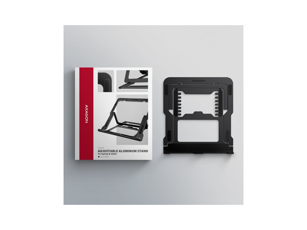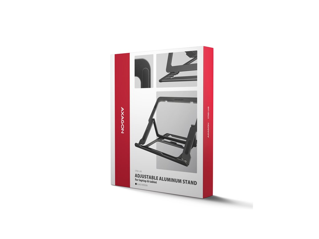 AXAGON STND-LAB je stojan na notebook či tablet, který zajišťuje pohodlí a zlepšuje ergonomii při práci. Je ideální pro zařízení s úhlopříčkou od 10'' do 17.3'' a umožňuje nastavení až osmi poloh. Snadno tak najdete ideální sklon stojanu pro maximální uvolnění vašich krčních a zádových svalů. Užijte si komfortní pracovní prostředí s kompaktním a přenosným stojanem, který se dokonale přizpůsobí vašim potřebám, ať už pracujete doma, v kanceláři, nebo na cestách. Podstavec je vyroben z hliníkových odlitků garantujících dlouhou životnost a spolehlivost. Díky protiskluzové úpravě se nemusíte obávat nežádoucích pohybů – vaše zařízení zůstane pevně na svém místě, a to bez poškození povrchu notebooku či podložky. Tyto pečlivě navržené vlastnosti zaručují perfektní stabilitu pro váš notebook, tablet nebo dokonce oblíbenou knihu, což vám poskytne klid a pohodlí při každodenním používání. Velkou výhodou je možnost nastavení až osmi poloh. Díky tomu můžete notebook zvednout do výšky od 91 do 150 mm. Tím získáte další pracovní plochu ve správné úrovni očí, což výrazně zlepšuje ergonomii a pohodlí při práci, a zároveň zvyšuje vaši produktivitu. Stojan lze snadno složit do kompaktních rozměrů, což umožňuje pohodlné přenášení kamkoli potřebujete. Jeho elegantní design v černé barvě nejen stylově doplní váš pracovní stůl, ale také přináší praktické funkce, které oceníte při každodenním používání. Provedení zajišťuje ideální odvod tepla z vašeho notebooku, čímž zvyšují jeho výkon a životnost. Vlastnosti: • Lehká a pevná kovová konstrukce. • Protiskluzová úprava, která zároveň chrání zařízení od poškrábání. • Vhodný pro 10''–17.3'' notebooky nebo jiná zařízení. • Osm nastavitelných pozic. • Nastavitelná výška 91–150 mm. • Nosnost dimenzována pro všechny typy notebooků: max. 20 kg. • Skladný a lehce složitelný. • Držák notebooku umožňuje lepší odvod tepla. • Rozměry: 220 × 230 × 15 mm (Š × H × V). • Hmotnost: 312 g. Balení v kartonové krabičce obsahuje: • Stojan na notebook/tablet, • černá verze provedení.
