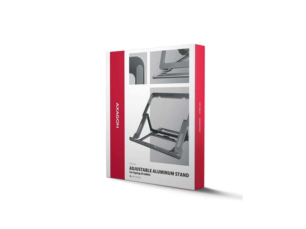 AXAGON STND-LAG je stojan na notebook či tablet, který zajišťuje pohodlí a zlepšuje ergonomii při práci. Je ideální pro zařízení s úhlopříčkou od 10'' do 17.3'' a umožňuje nastavení až osmi poloh. Snadno tak najdete ideální sklon stojanu pro maximální uvolnění vašich krčních a zádových svalů. Užijte si komfortní pracovní prostředí s kompaktním a přenosným stojanem, který se dokonale přizpůsobí vašim potřebám, ať už pracujete doma, v kanceláři, nebo na cestách. Podstavec je vyroben z hliníkových odlitků garantujících dlouhou životnost a spolehlivost. Díky protiskluzové úpravě se nemusíte obávat nežádoucích pohybů – vaše zařízení zůstane pevně na svém místě, a to bez poškození povrchu notebooku či podložky. Tyto pečlivě navržené vlastnosti zaručují perfektní stabilitu pro váš notebook, tablet nebo dokonce oblíbenou knihu, což vám poskytne klid a pohodlí při každodenním používání. Velkou výhodou je možnost nastavení až osmi poloh. Díky tomu můžete notebook zvednout do výšky od 91 do 150 mm. Tím získáte další pracovní plochu ve správné úrovni očí, což výrazně zlepšuje ergonomii a pohodlí při práci, a zároveň zvyšuje vaši produktivitu. Stojan lze snadno složit do kompaktních rozměrů, což umožňuje pohodlné přenášení kamkoli potřebujete. Jeho elegantní design v šedé barvě nejen stylově doplní váš pracovní stůl, ale také přináší praktické funkce, které oceníte při každodenním používání. Provedení zajišťuje ideální odvod tepla z vašeho notebooku, čímž zvyšují jeho výkon a životnost. Vlastnosti: • Lehká a pevná kovová konstrukce. • Protiskluzová úprava, která zároveň chrání zařízení od poškrábání. • Vhodný pro 10''–17.3'' notebooky nebo jiná zařízení. • Osm nastavitelných pozic. • Nastavitelná výška 91–150 mm. • Nosnost dimenzována pro všechny typy notebooků: max. 20 kg. • Skladný a lehce složitelný. • Držák notebooku umožňuje lepší odvod tepla. • Rozměry: 220 × 230 × 15 mm (Š × H × V). • Hmotnost: 312 g. Balení v kartonové krabičce obsahuje: • Stojan na notebook/tablet, • šedá verze provedení.