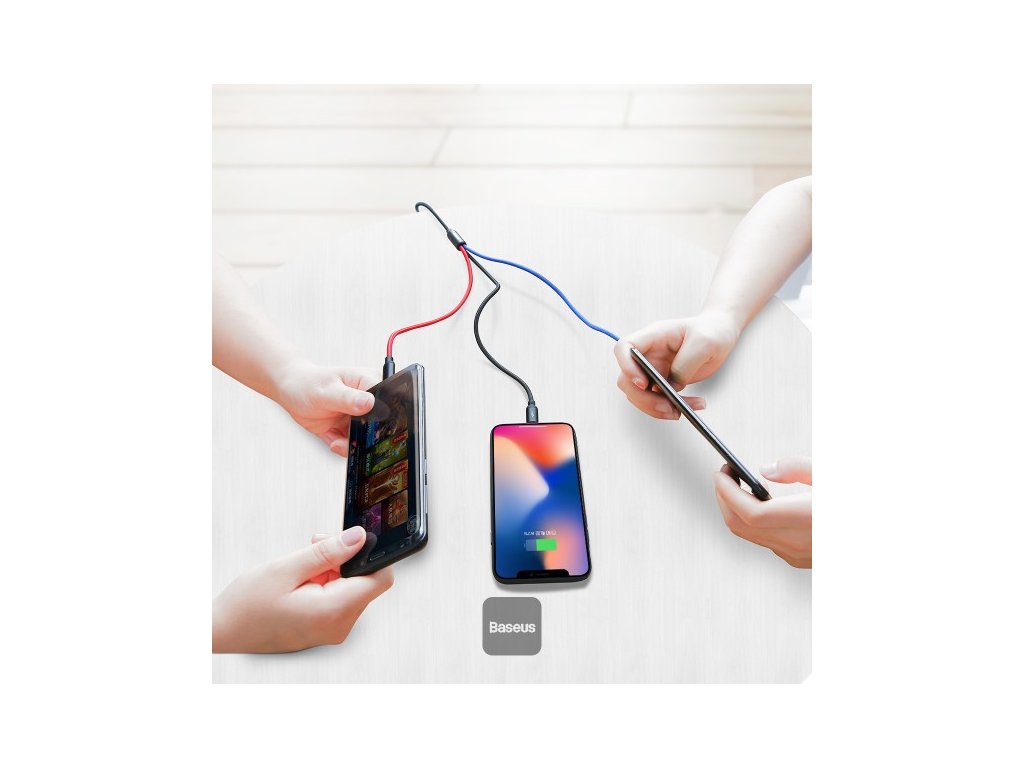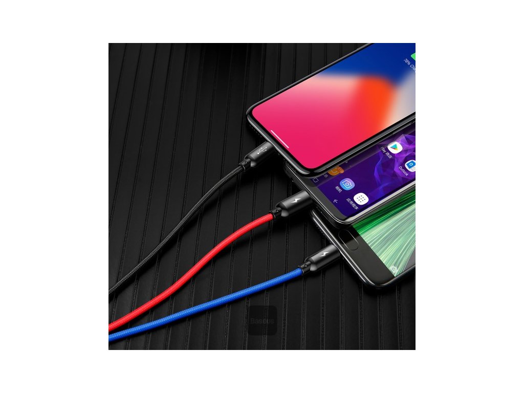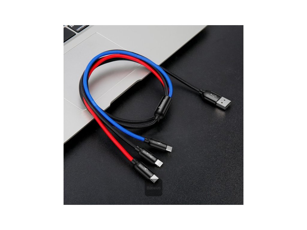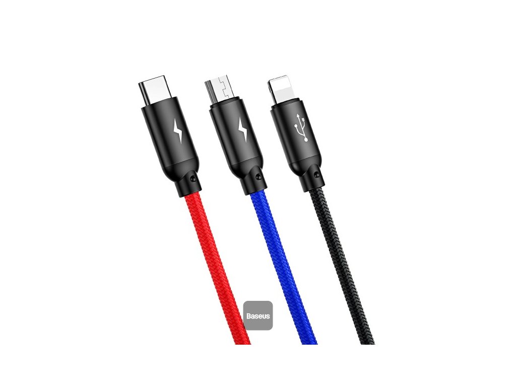 Baseus 3 in 1 Cable 3 Primary Colors Type C, Lightning , Micro 3A 1.2M Specifikace * Materiál: Hliník, nylon * Výstupní proud: 3 A * Barva: Černá * Konektory: USB na Lightning + MicroUSB + USB-C * Délka: 1,2 m (90 cm k rozbočce + 30 cm ke konektoru)