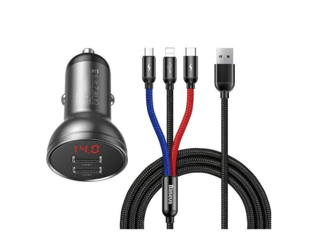 Rychlonabíječka do auta Baseus 2xUSB 4,8A 24W s displejem + 3v1 kabel černá Nabíječka do auta s dvěma výstupy USB, které poskytují výkon 24 W a proud 4,8 A. Zaručuje bezpečné nabíjení jakéhokoli mobilního zařízení. Je vyroben z odolných materiálů PC a ABS, odolných vůči vysokým teplotám a vnějšímu poškození. Díky kompaktním rozměrům lze nabíječku snadno umístit do zapalovače cigaret v autě. Na přední straně přístroje je indikátor napětí. Materiály a ochranné technologie použité při nabíjení eliminují pravděpodobnost zkratu, přehřátí, přebití a dalších nežádoucích faktorů. Součástí balení je zesílený 1,2m kabel USB 3v1. *Barva: tmavě šedá *Materiál: PC / ABS (odolný proti plamenu) *Kompatibilita: univerzální *Napětí (vstupní): DC 12V-24V *Velikost: 34 mm x 59,5 mm, Hmotnost: 28 g *Konektor: 2x USB-A *USB1 / USB2: 5V/2,4A *USB-A + USB-A = 5V/4,8A *Výkon: 24 W *Certifikace: CE, RoHS, FC *Kabel je součástí dodávky: 3v1 USB - Lightning/Micro USB/Type C *Není kompatibilní s vozidly Audi z roku 2015 a mladšími.