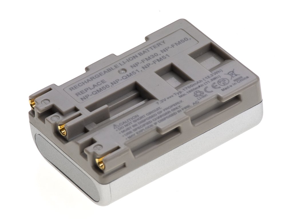 Typ: Li-ion Kapacita: 1700 mAh (12.2 Wh) Barva: stříbrná Napětí: 7.2 V Rozměry: 55.5x38.6x20.5 mm Hmotnost: 55 g Produktová čísla: NP-FM30, NP-FM50, NP-FM51, NP-QM50, NP-QM51 Kompatibilní modely: Sony CCD-TR108, Sony CCD-TR208, Sony CCD-TR408, Sony CCD-TR748, Sony CCD-TR748E, Sony CCD-TRV106K, Sony CCD-TRV108, Sony CCD-TRV116, Sony CCD-TRV118, Sony CCD-TRV126, Sony CCD-TRV128, Sony CCD-TRV138, Sony CCD-TRV208, Sony CCD-TRV218E, Sony CCD-TRV228, Sony CCD-TRV238, Sony CCD-TRV308, Sony CCD-TRV318, Sony CCD-TRV328, Sony CCD-TRV338, Sony CCD-TRV408, Sony CCD-TRV418, Sony CCD-TRV418E, Sony CCD-TRV428, Sony CCD-TRV608, Sony CCD-TRV730, Sony CCD-TRV740, Sony DCR-DVD100, Sony DCR-DVD101, Sony DCR-DVD101E, Sony DCR-DVD101E, Sony DCR-DVD200, Sony DCR-DVD201, Sony DCR-DVD201E, Sony DCR-DVD201E, Sony DCR-DVD300, Sony DCR-DVD301, Sony DCR-DVD91, Sony DCR-DVD91E, Sony DCR-HC14, Sony DCR-HC14E, Sony DCR-HC88, Sony DCR-PC100, Sony DCR-PC101, Sony DCR-PC101E, Sony DCR-PC101K, Sony DCR-PC103, Sony DCR-PC104E, Sony DCR-PC105, Sony DCR-PC105E, Sony DCR-PC105K, Sony DCR-PC110, Sony DCR-PC110E, Sony DCR-PC115, Sony DCR-PC120, Sony DCR-PC120BT, Sony DCR-PC120E, Sony DCR-PC155E, Sony DCR-PC300K, Sony DCR-PC330, Sony DCR-PC9, Sony DCR-PC9E, Sony DCR-TRV10, Sony DCR-TRV11, Sony DCR-TRV140, Sony DCR-TRV145, Sony DCR-TRV145E, Sony DCR-TRV17, Sony DCR-TRV18, Sony DCR-TRV19, Sony DCR-TRV20, Sony DCR-TRV22K, Sony DCR-TRV230, Sony DCR-TRV230E, Sony DCR-TRV240, Sony DCR-TRV25, Sony DCR-TRV250, Sony DCR-TRV255, Sony DCR-TRV260, Sony DCR-TRV265E, Sony DCR-TRV27, Sony DCR-TRV270E, Sony DCR-TRV280, Sony DCR-TRV285E, Sony DCR-TRV30, Sony DCR-TRV33, Sony DCR-TRV330, Sony DCR-TRV33E, Sony DCR-TRV33K, Sony DCR-TRV340, Sony DCR-TRV350, Sony DCR-TRV360, Sony DCR-TRV38, Sony DCR-TRV39, Sony DCR-TRV460, Sony DCR-TRV460E, Sony DCR-TRV480, Sony DCR-TRV480E, Sony DCR-TRV50, Sony DCR-TRV530, Sony DCR-TRV6, Sony DCR-TRV70, Sony DCR-TRV730, Sony DCR-TRV740, Sony DCR-TRV8, Sony DCR-TRV80, Sony DCR-TRV830, Sony DCR-TRV840, Sony DCR-TRV950, Sony DSC-F707, Sony DSC-F717, Sony DSC-F828, Sony DSC-R1, Sony DSC-S30, Sony DSC-S50, Sony DSC-S70, Sony DSC-S75, Sony DSC-S85, Sony DSR-PDX10, Sony MVC-CD200, Sony MVC-CD250, Sony MVC-CD300, Sony MVC-CD350, Sony MVC-CD400, Sony MVC-CD500