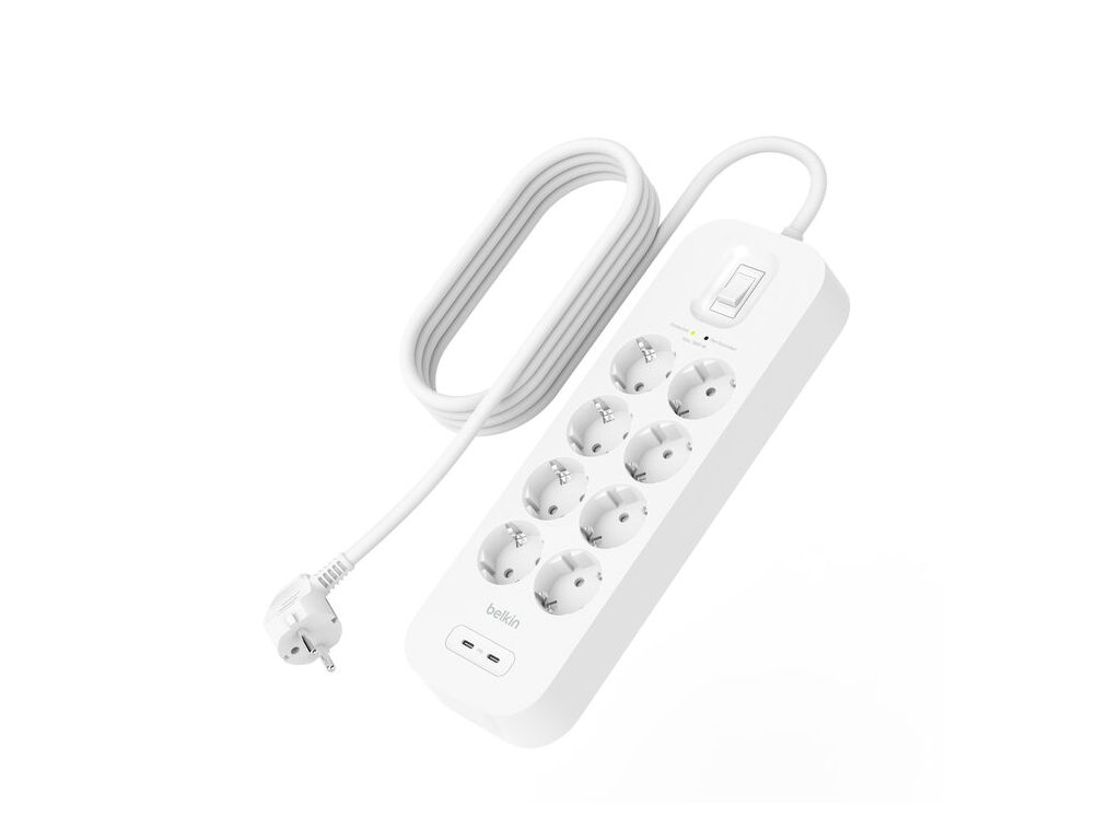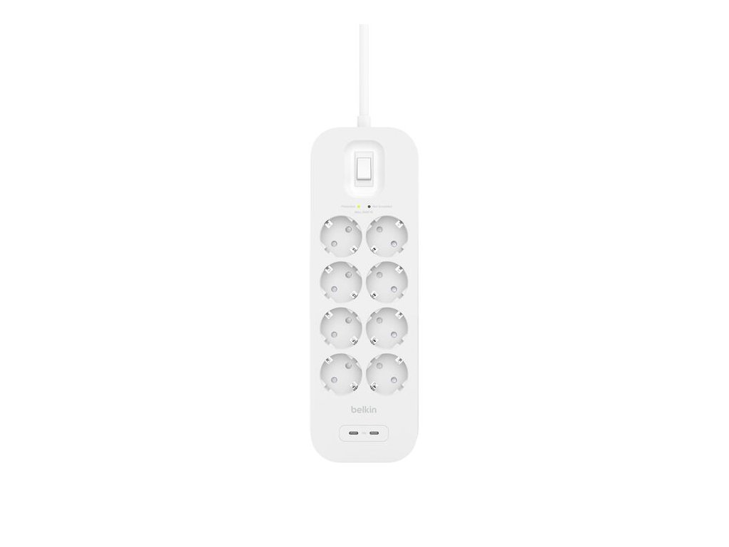 BELKIN přepěťová ochrana se dvěma porty USB-C (8 zásuvek + 2x USB-C) *Přepěťová ochrana až 900 joulů prodlužuje životnost vaší elektroniky a zařízení *Osm zásuvek a dva porty USB-C poskytují možnosti připojení mnoha zařízení *USB-C PD dokáže nabít vaše zařízení až o 70 % rychleji než tradiční 5W nabíječky *Technologie Dynamic PPS udržuje baterii připojeného zařízení v dobrém stavu a detekuje, co zařízení potřebuje pro optimální nabití *Nový a chytřejší design: přidává bezpečnostní prvky, které minimalizují dopady elektrické nerovnováhy *2m napájecí kabel vám umožňuje umístit přepěťovou ochranu kamkoli chcete *Montážní výřezy umožňují snadnou montáž na zeď a šetří tak místo *Kontrolky vás informují o tom, že jsou vaše zařízení chráněna a kdy je třeba vyměnit přepěťovou ochranu Obsah balení: *BELKIN přepěťová ochrana se dvěma porty USB-C (8 zásuvek + 2x USB-C)  ,Záruka: 2 roky