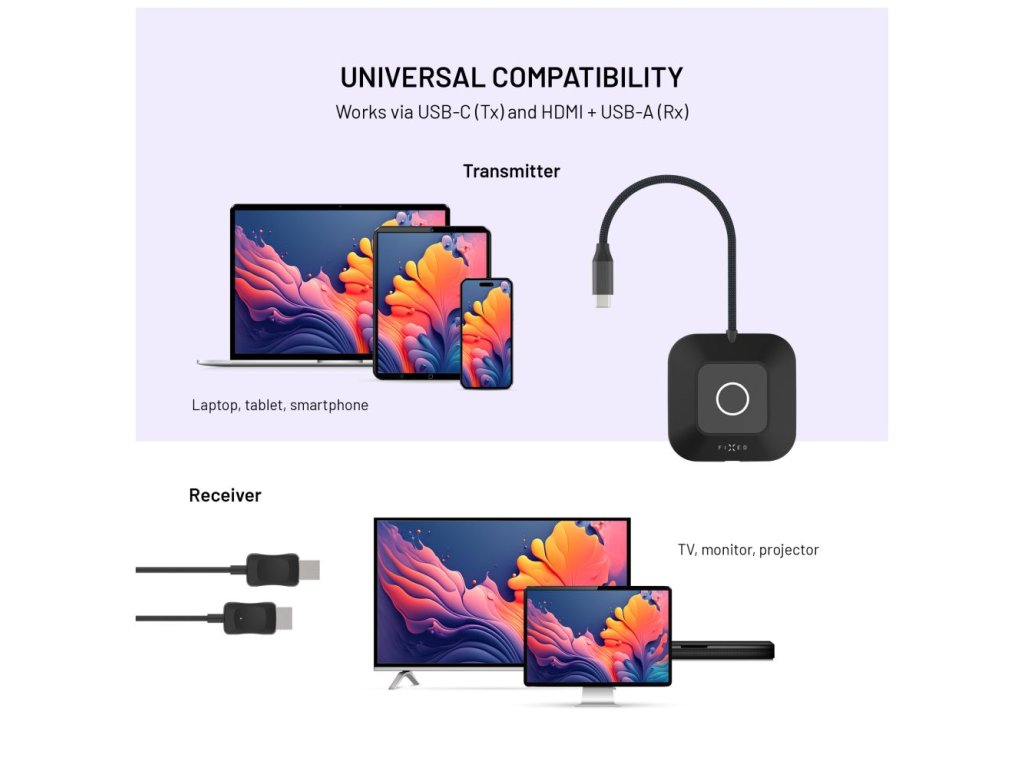 Popis produktu: Bezdrátový HDMI adaptér FIXED AirLink umožní snadné streamování obrazu z notebooku na televizi, monitor či projektor bez nutnosti dalších kabelů nebo instalace aplikací a ovladačů. Stačí zapojit kompaktní vysílač do USB-C portu notebooku či jiného zařízení s funkcí přenosu dat, přijímač připojit do HDMI a USB portu zobrazovacího zařízení a jedním stiskem tlačítka obě části spárovat. Během okamžiku dojde k propojení a již můžete využívat plynulého zrcadlení obrazu. Adaptér podporuje rozlišení Full HD 1080p při 60 Hz a nabízí režim zrcadlení i rozšířené plochy, což oceníte jak při práci, tak zábavě. Díky minimální latenci v řádu maximálně 10 milisekund je obraz přenášen prakticky v reálném čase, bez viditelného zpoždění při sledování videí, filmů nebo prezentací. FIXED AirLink zároveň umožňuje rychlé průchozí nabíjení přes USB-C port s podporou Power Delivery o výkonu až 100W, takže můžete pohodlně sdílet a zároveň notebook napájet. Adaptér je kompatibilní s Windows, macOS, iOS i Android zařízeními, která mají USB-C nebo Thunderbolt 3/4 port s podporou DisplayPort Alt Mode. Dosah přenosu činí 30 metrů a odolný 20 cm opletený kabel zajišťuje dlouhou životnost. S FIXED AirLink přenášejte obraz zcela bezstarostně a kdekoliv. Vlastnosti: - bezdrátový HDMI adaptér - přenos obrazu z notebooku na televizi, monitor či projektor - dva režimy zobrazení – zrcadlení nebo rozšířená plocha - vysílač s USB-C konektorem - přijímač s HDMI a USB konektory - Plug & Play – párování jediným stiskem bez nutnosti instalování ovladačů - čistý obraz v 2K UHD 1920*1080 60Hz - velmi nízká latence 7-10 ms pro plynulost přenosu - podpora HDCP 1.4 - ochrana přenosu digitálního obsahu v nejlepší kvalitě - USB-C nabíjení až 100W PD 3.0 - možnost rychlého průchozího nabíjení během sdílení - dosah bezdrátového připojení až 30 m - kompatibilní s USB-C nebo Thunderbolt 3/4 portem s podporou DisplayPort Alt Mode - integrovaný opletený kabel – 20 cm Technické detaily: - vstup USB-C: 100W PD 3.0 - koncovky přijímače: HDMI + USB-A (5V/1A napájení) - rozlišení: 720P/1080i/1080p 60Hz - dosah bezdrátového připojení: 30 m - délka opleteného kabelu vysílače: 20 cm - délka kabelu přijímače: 75 cm - materiál: ABS, nylon - rozměr: 70 x 73 x 13 mm (bez kabelu) - váha: 42 g