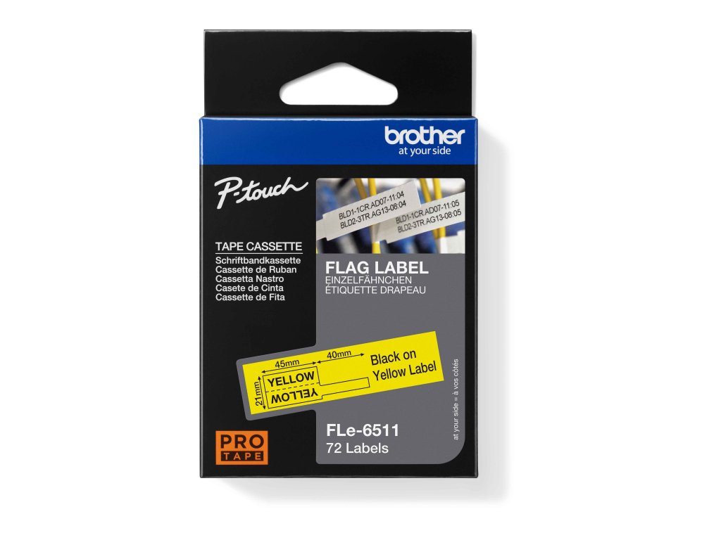 Tato kazeta s páskem FLe-6511 je vyvinuta pro snadné značení kabelů a vláken. *Černý text na žlutém předřezaném štítku *45 mm x 21 mm při tisku, 45 mm x 10,5 mm při nalepení *72 štítků na jedné pásce *Vysoce kvalitní originální štítky Brother *Jasné a trvanlivé výsledky Páska je vyvinuta pro snadné značení elektro, síťových a jiných kabelů, optických vláken,.. Jedná se o černý text na žlutém podkladu. Páska obsahuje 72 štítků s rozměry 45 mm x 21 mm (po nalepení jsou rozměry 45 mm x 10,5 mm). Tato popisovací černo-žlutá páska FLe-6511 je ideální jak pro identifikaci kabelů tak pro univerzální použití. Jednoduše vytiskněte text nebo čárový kód na dvě části předřezaného štítku. Připevněte proužek štítku kolem kabelu, poté vezměte vytištěný předřezaný štítek a jednu polovinu přilepte na proužek štítku a poté jej přeložte přes druhou polovinu. Lze použít ve vybraných Brother tiskárnách umožňujících potisk FLE pásek.
