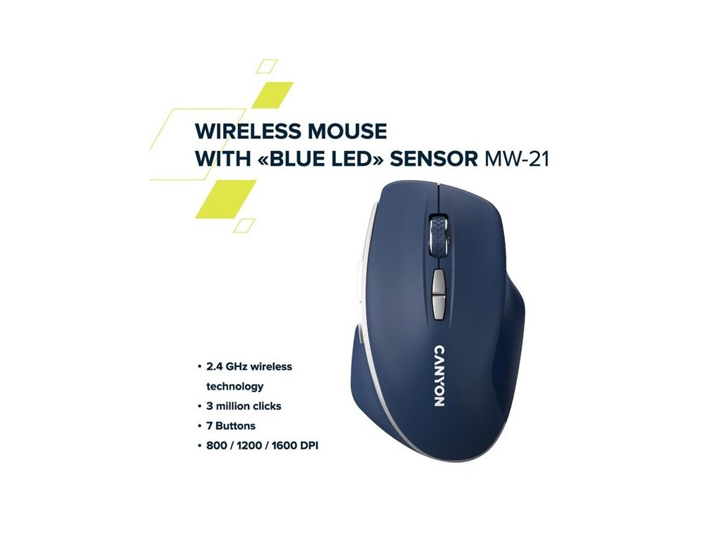 V rámci Canyon sortomentu príslušenstva je toto riešenie jedno z najúspešnejších. Vďaka zdokonalenému LED senzoru s technológiou "Blue LED" (modrá LED), táto myš pracuje ešte presnejšie, ako ktorá koľvek iná myš v tejto triede. Navyše, s technológiou úspory energie zvýši prevádzkovú dobu až o 20% ! USB prijímač Wireless 2.4 GHz umožní udržiavať vysoko kvalitné pripojenie bez zahltenia a zneprehladnenia pracovnej plochy zbytočnými drôtmi. 7 odolných tlačidiel a 3 úrovne prepínania rozlíšenia DPI zabezpečia optimálnu prevádzkovú funkčnosť. Monolitický, ergonomický dizajn pre pravákov a odolný kryt vďaka technológiám "UV Matt" a "Rubber Coating" robia z myši dôstojného spoločníka pre každý pracovný deň.